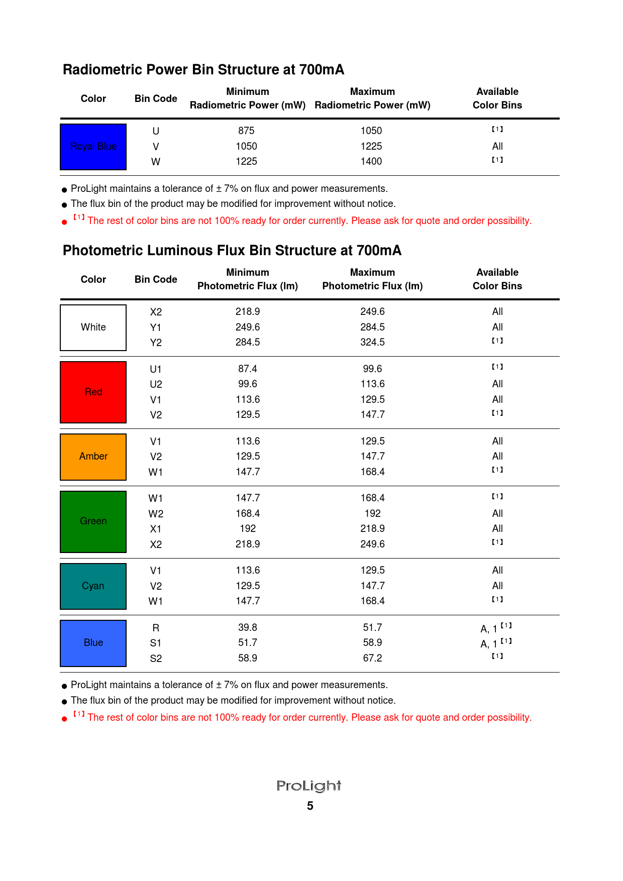 X2 218.9 249.6 All White Y1 249.6 284.5 All Y2 284.5 324.5 【1】 U1 【1】 87.4 99.6 U2 99.6 113.6 All Red V1 113.6 129.5 All V2 【1】 129.5 147.7 V1 113.6 129.5 All Amber V2 129.5 147.7 All W1 147.7 168.4 【1】 W1 【1】 147.7 168.4 W2 168.4 192 All Green X1 192 218.9 All X2 【1】 218.9 249.6 V1 113.6 129.5 All Cyan V2 129.5 147.7 All W1 147.7 168.4 【1】 R 39.8 51.7 A, 1【1】 Blue S1 51.7 58.9 A, 1【1】 S2 58.9 67.2 【1】 ● ProLight maintains a tolerance of ± 7% on flux and power measurements. ● The flux bin of the product may be modified for improvement without notice. 【1】 ● The rest of color bins are not 100% ready for order currently. Please ask for quote and order possibility.