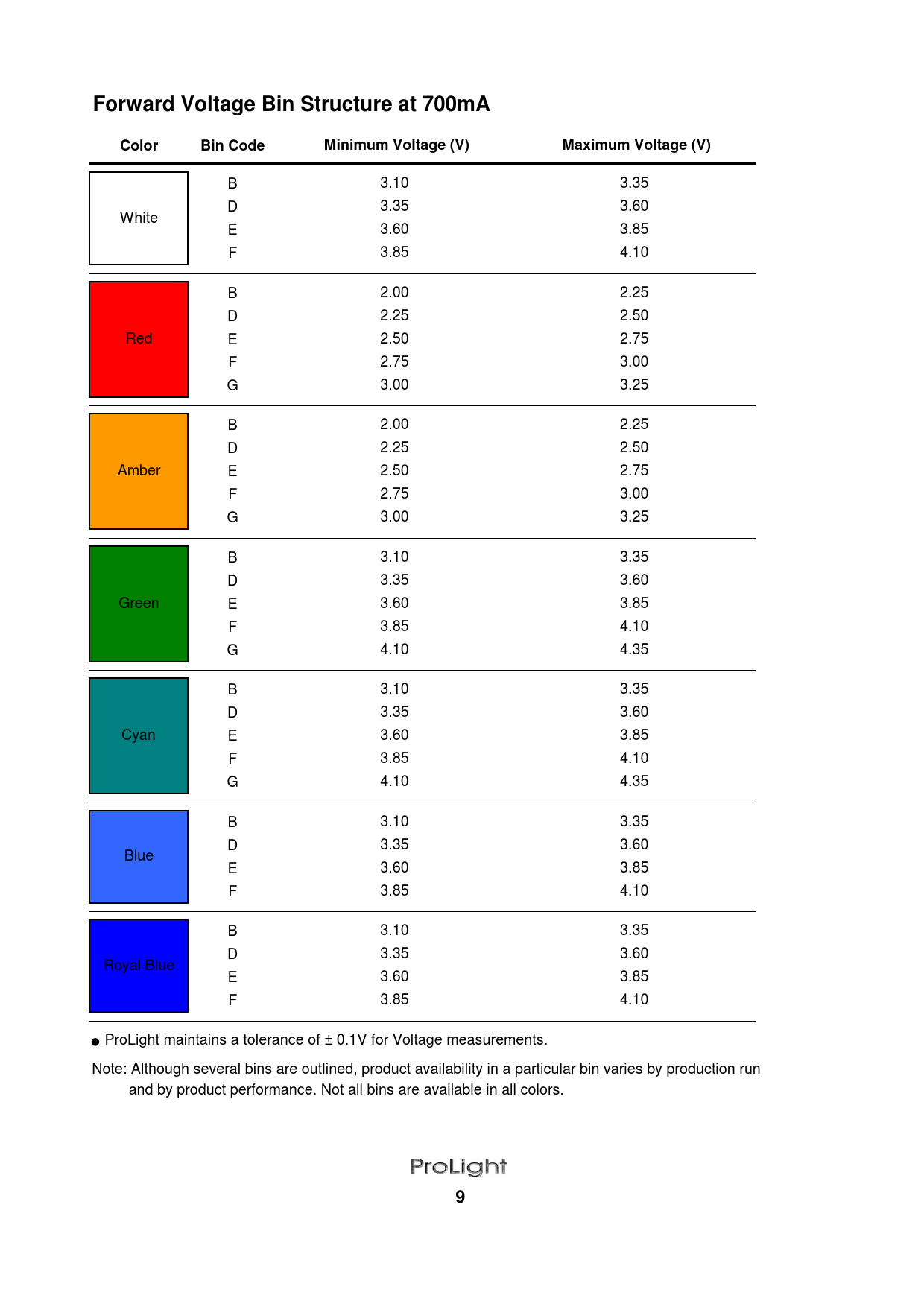 B 3.10 3.35 D 3.35 3.60 White E 3.60 3.85 F 3.85 4.10 B 2.00 2.25 D 2.25 2.50 Red E 2.50 2.75 F 2.75 3.00 G 3.00 3.25 B 2.00 2.25 D 2.25 2.50 Amber E 2.50 2.75 F 2.75 3.00 G 3.00 3.25 B 3.10 3.35 D 3.35 3.60 Green E 3.60 3.85 F 3.85 4.10 G 4.10 4.35 B 3.10 3.35 D 3.35 3.60 Cyan E 3.60 3.85 F 3.85 4.10 G 4.10 4.35 B 3.10 3.35 D 3.35 3.60 Blue E 3.60 3.85 F 3.85 4.10 B 3.10 3.35 D 3.35 3.60 Royal Blue E 3.60 3.85 F 3.85 4.10 ● ProLight maintains a tolerance of ± 0.1V for Voltage measurements. Note: Although several bins are outlined, product availability in a particular bin varies by production run and by product performance. Not all bins are available in all colors.