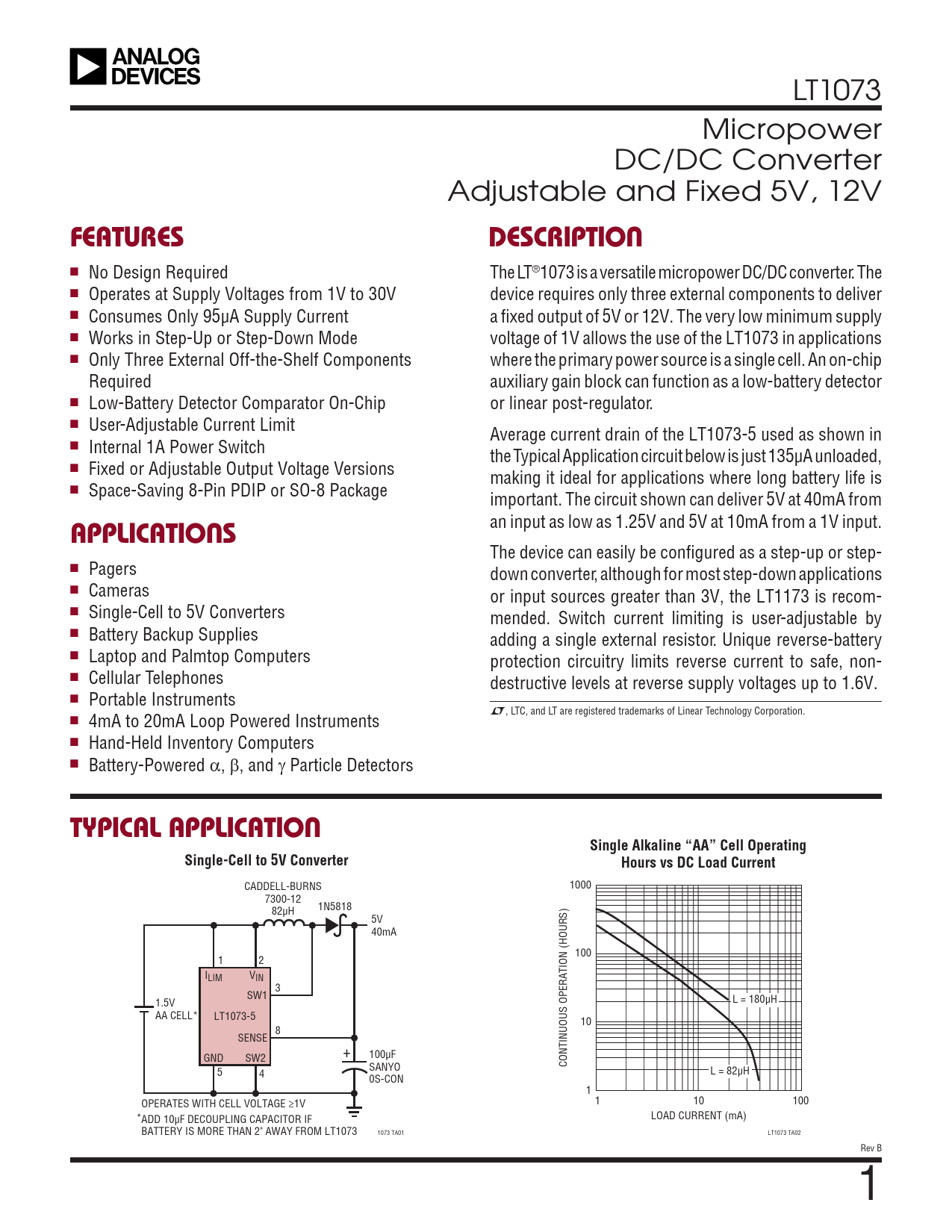 LT1073 Micropower DC/DC Converter Adjustable and Fixed 5V, 12V FEATURESDESCRIPTION n No Design Required The LT®1073 is a versatile micropower DC/DC converter. The n Operates at Supply Voltages from 1V to 30V device requires only three external components to deliver n Consumes Only 95µA Supply Current a fixed output of 5V or 12V. The very low minimum supply n Works in Step-Up or Step-Down Mode voltage of 1V allows the use of the LT1073 in applications n Only Three External Off-the-Shelf Components where the primary power source is a single cell. An on-chip Required auxiliary gain block can function as a low-battery detector n Low-Battery Detector Comparator On-Chip or linear post-regulator. n User-Adjustable Current Limit Average current drain of the LT1073-5 used as shown in n Internal 1A Power Switch the Typical Application circuit below is just 135µA unloaded, n Fixed or Adjustable Output Voltage Versions making it ideal for applications where long battery life is n Space-Saving 8-Pin PDIP or SO-8 Package important. The circuit shown can deliver 5V at 40mA from an input as low as 1.25V and 5V at 10mA from a 1V input. APPLICATIONS The device can easily be configured as a step-up or step- n Pagers down converter, although for most step-down applications n Cameras or input sources greater than 3V, the LT1173 is recom- n Single-Cell to 5V Converters mended. Switch current limiting is user-adjustable by n Battery Backup Supplies adding a single external resistor. Unique reverse-battery n Laptop and Palmtop Computers protection circuitry limits reverse current to safe, non- n Cellular Telephones destructive levels at reverse supply voltages up to 1.6V. n Portable Instruments L, LTC, and LT are registered trademarks of Linear Technology Corporation. n 4mA to 20mA Loop Powered Instruments n Hand-Held Inventory Computers n Battery-Powered α, β, and γ Particle Detectors TYPICAL APPLICATIONSingle Alkaline “AA” Cell OperatingSingle-Cell to 5V ConverterHours vs DC Load Current CADDELL-BURNS 1000 7300-12 1N5818 82µH 5V 40mA 100 1 2 ILIM VIN 3 SW1 1.5V L = 180µH AA CELL* LT1073-5 10 8 SENSE + 100µF GND SW2 SANYO CONTINUOUS OPERATION (HOURS) 5 4 L = 82µH 0S-CON 1 OPERATES WITH CELL VOLTAGE ≥1V 1 10 100 ADD 10µF DECOUPLING CAPACITOR IF * LOAD CURRENT (mA) BATTERY IS MORE THAN 2" AWAY FROM LT1073 1073 TA01 LT1073 TA02 Rev B 1 Document Outline Features Applications Description Typical Application Absolute Maximum Ratings Pin Configuration Electrical Characteristics Typical Performance Characteristics Pin Functions Block Diagrams Operation Applications Information Typical Applications Package Description Typical Application Related Parts