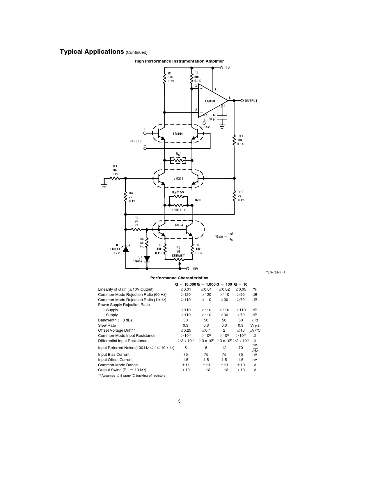 Typical. Applications. (Continued). High. Performance. Instrumentation. Amplifier. 106. *Gain. e. RS. TL/H/9241. –. 7. Performance. Characteristics. G. e