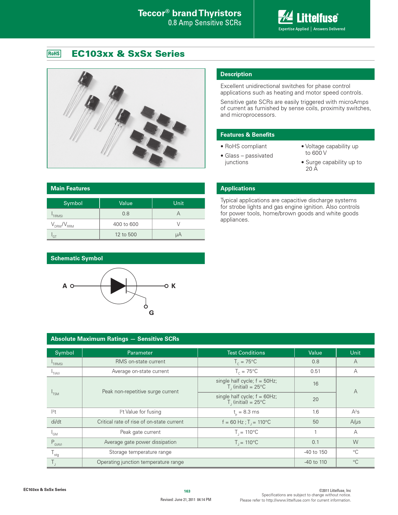 Teccor® brand Thyristors. Description. Features & Benefits. Main Features. Applications. Schematic Symbol