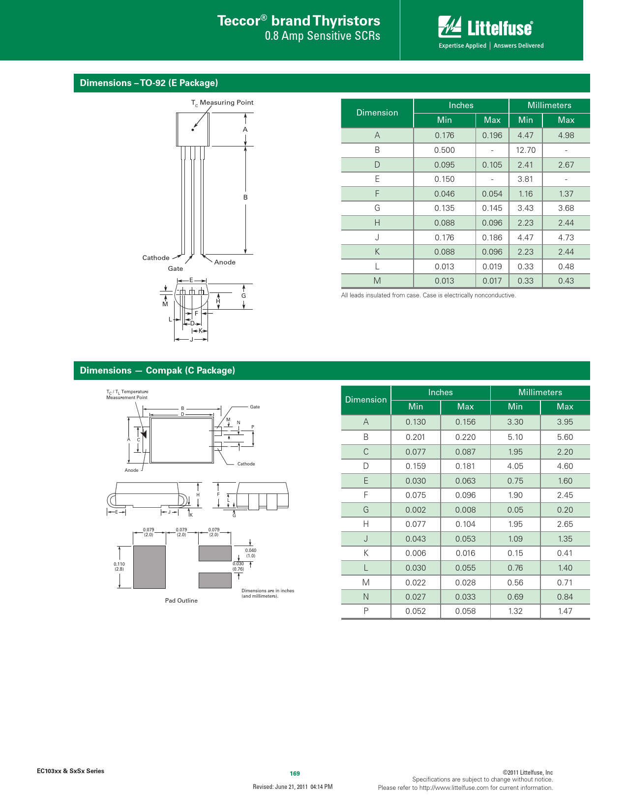 Teccor® brand Thyristors. Dimensions – TO-92 (E Package). Dimensions — Compak (C Package). EC103xx & SxSx Series. 169