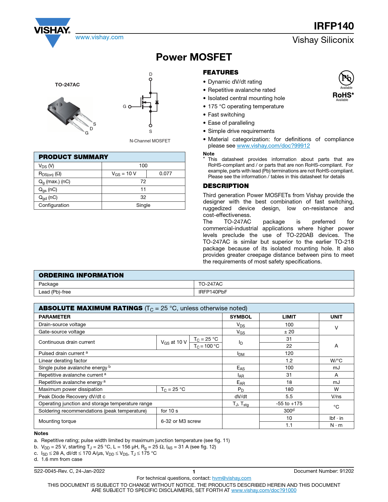 IRFP140. Power MOSFET. FEATURES. TO-247AC. Note. PRODUCT SUMMARY. DESCRIPTION. ORDERING INFORMATION. ABSOLUTE MAXIMUM RATINGS