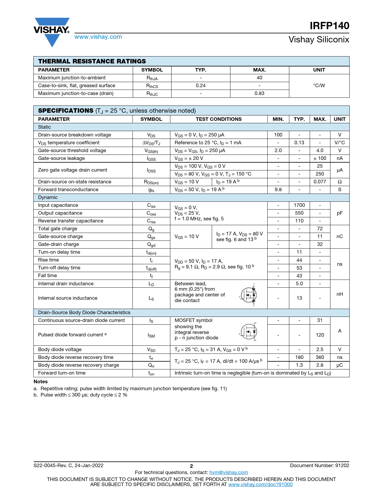 IRFP140. THERMAL RESISTANCE RATINGS PARAMETER SYMBOL. TYP. MAX. UNIT. SPECIFICATIONS. PARAMETER SYMBOL. TEST. CONDITIONS. MIN. Notes