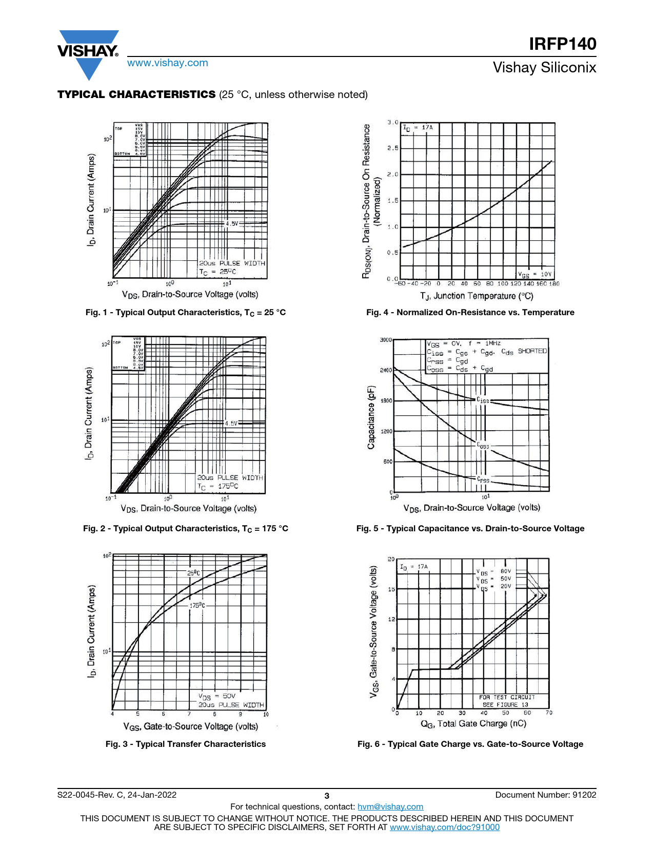 Fig. 1 - Typical Output Characteristics, TC = 25 °C Fig. 4 - Normalized On-Resistance vs. Temperature Fig. 2 - Typical Output Characteristics, TC = 175 °C Fig. 5 - Typical Capacitance vs. Drain-to-Source Voltage Fig. 3 - Typical Transfer Characteristics Fig. 6 - Typical Gate Charge vs. Gate-to-Source Voltage