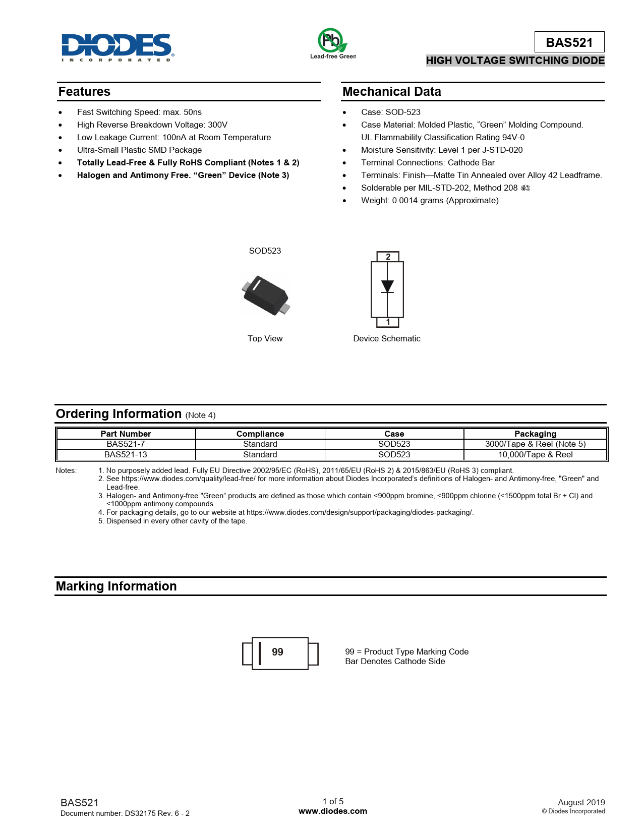 99 = Product Type Marking Code Bar Denotes Cathode Side BAS521 1 of 5 August 2019 Document number: DS32175 Rev. 6 - 2