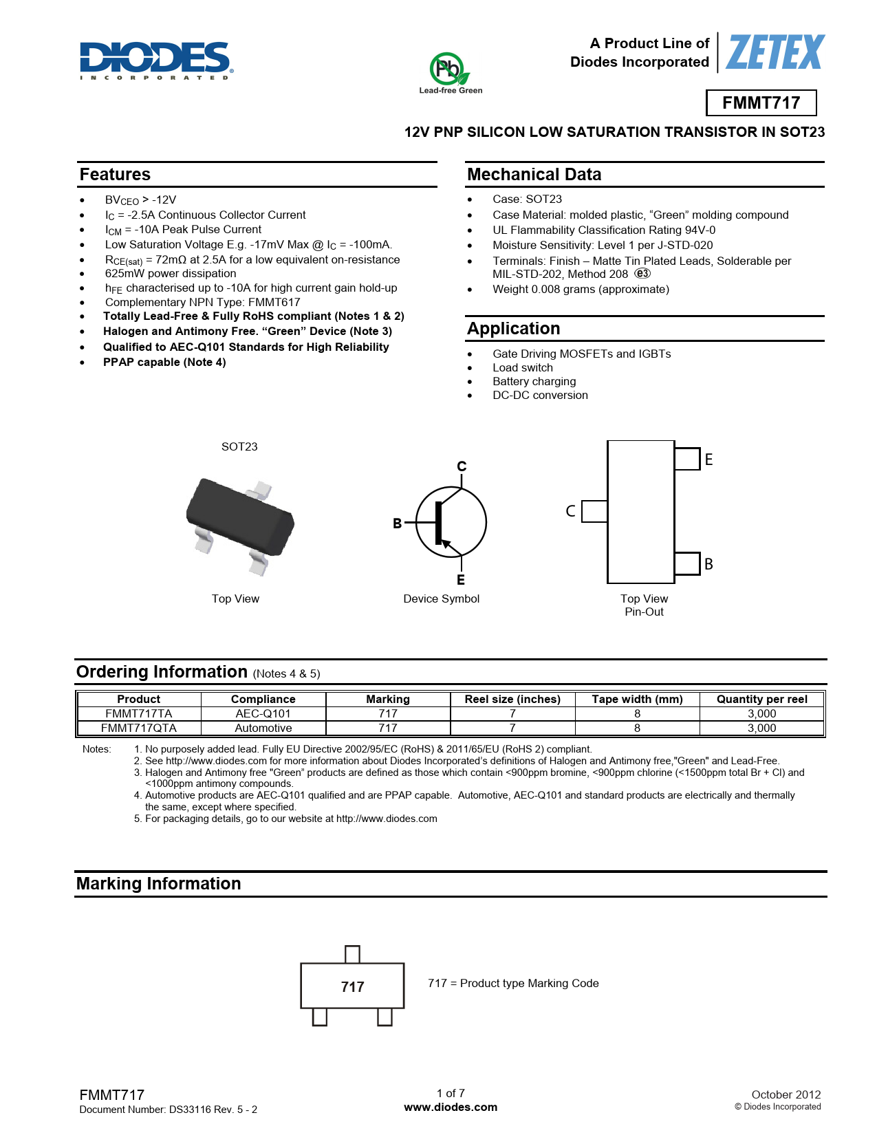 A Product Line of. Diodes Incorporated. FMMT717. 12V PNP SILICON LOW SATURATION TRANSISTOR IN SOT23. Features. Mechanical Data