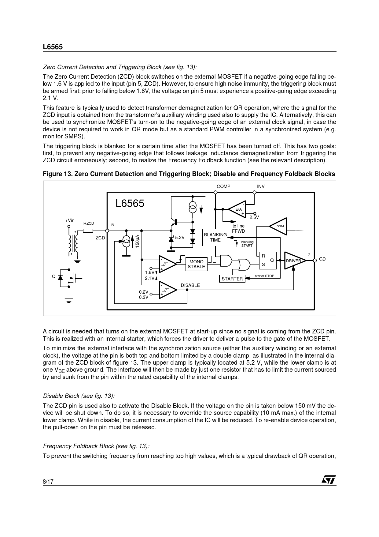 Zero Current Detection and Triggering Block (see fig. 13): The Zero Current Detection (ZCD) block switches on the external MOSFET if a negative-going edge falling be- low 1.6 V is applied to the input (pin 5, ZCD). However, to ensure high noise immunity, the triggering block must be armed first: prior to falling below 1.6V, the voltage on pin 5 must experience a positive-going edge exceeding 2.1 V. This feature is typically used to detect transformer demagnetization for QR operation, where the signal for the ZCD input is obtained from the transformer's auxiliary winding used also to supply the IC. Alternatively, this can be used to synchronize MOSFET's turn-on to the negative-going edge of an external clock signal, in case the device is not required to work in QR mode but as a standard PWM controller in a synchronized system (e.g. monitor SMPS). The triggering block is blanked for a certain time after the MOSFET has been turned off. This has two goals: first, to prevent any negative-going edge that follows leakage inductance demagnetization from triggering the ZCD circuit erroneously; second, to realize the Frequency Foldback function (see the relevant description).