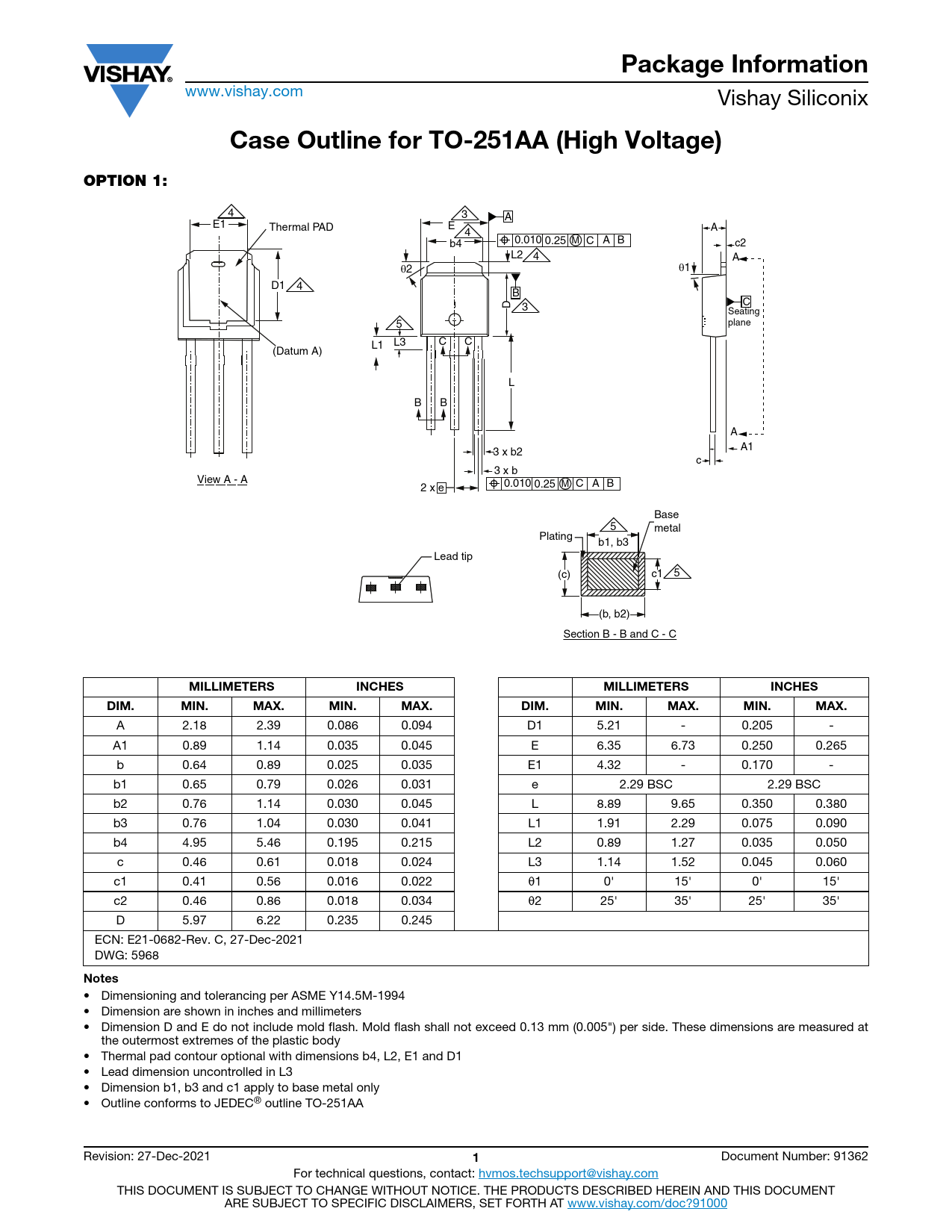 • Dimensioning and tolerancing per ASME Y14.5M-1994 • Dimension are shown in inches and millimeters • Dimension D and E do not include mold flash. Mold flash shall not exceed 0.13 mm (0.005") per side. These dimensions are measured at the outermost extremes of the plastic body • Thermal pad contour optional with dimensions b4, L2, E1 and D1 • Lead dimension uncontrolled in L3 • Dimension b1, b3 and c1 apply to base metal only • Outline conforms to JEDEC® outline TO-251AA Revision: 27-Dec-2021