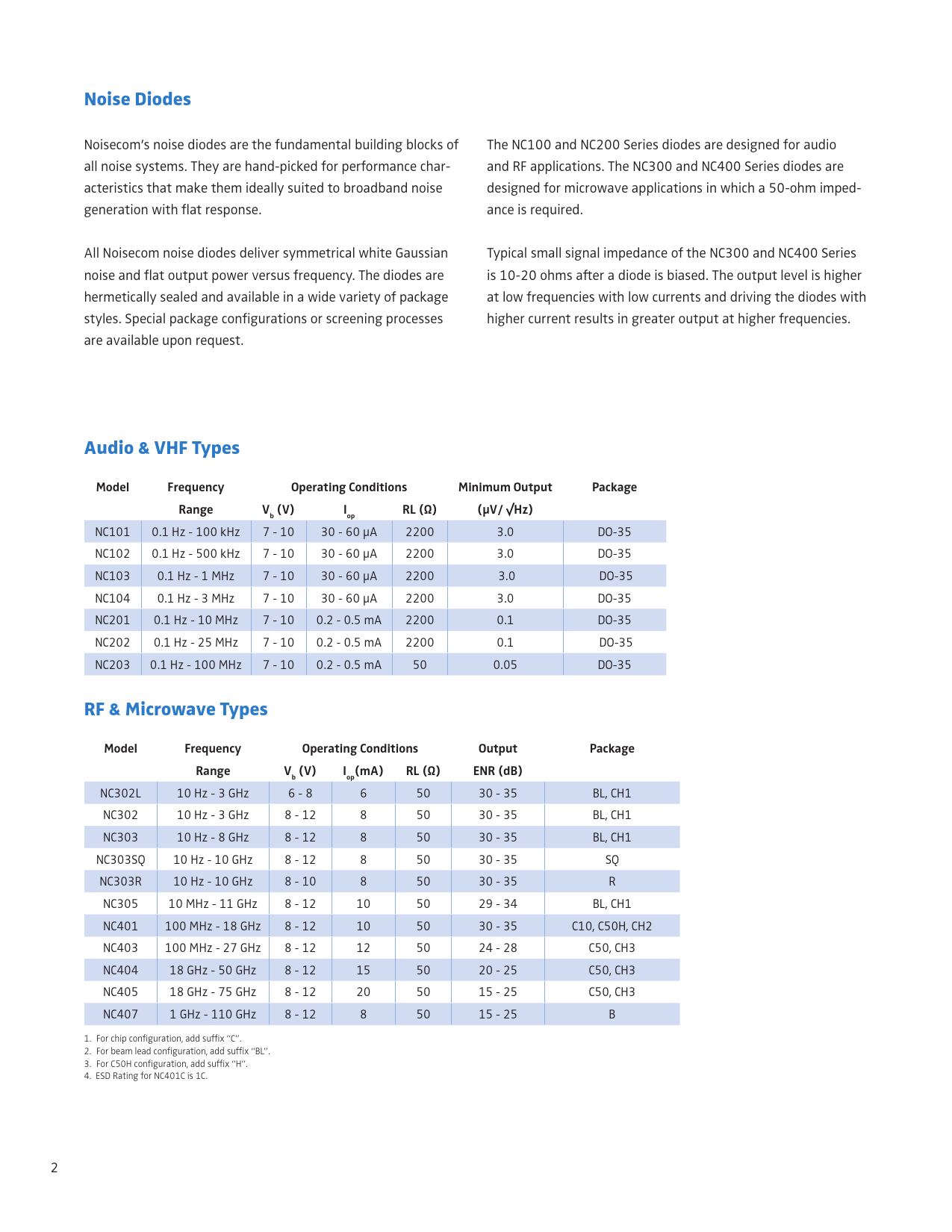 NC302L 10 Hz - 3 GHz 6 - 8 6 50 30 - 35 BL, CH1 NC302 10 Hz - 3 GHz 8 - 12 8 50 30 - 35 BL, CH1 NC303 10 Hz - 8 GHz 8 - 12 8 50 30 - 35 BL, CH1 NC303SQ 10 Hz - 10 GHz 8 - 12 8 50 30 - 35 SQ NC303R 10 Hz - 10 GHz 8 - 10 8 50 30 - 35 R NC305 10 MHz - 11 GHz 8 - 12 10 50 29 - 34 BL, CH1 NC401 100 MHz - 18 GHz 8 - 12 10 50 30 - 35 C10, C50H, CH2 NC403 100 MHz - 27 GHz 8 - 12 12 50 24 - 28 C50, CH3 NC404 18 GHz - 50 GHz 8 - 12 15 50 20 - 25 C50, CH3 NC405 18 GHz - 75 GHz 8 - 12 20 50 15 - 25 C50, CH3 NC407 1 GHz - 110 GHz 8 - 12 8 50 15 - 25 B 1. For chip configuration, add suffix “C”. 2. For beam lead configuration, add suffix “BL”. 3. For C50H configuration, add suffix “H”. 4. ESD Rating for NC401C is 1C. 2