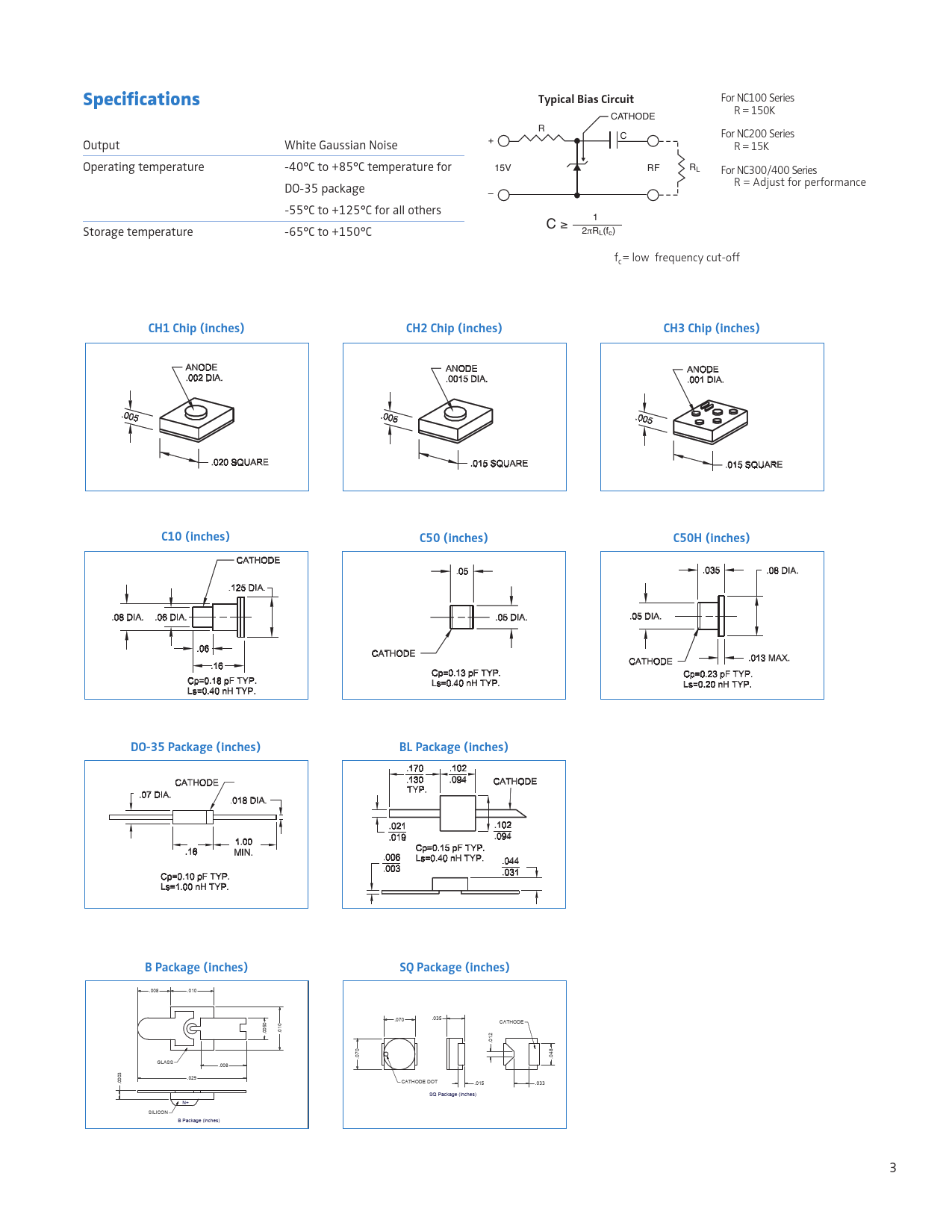 For NC100 Series CATHODE R = 150K R For NC200 Series Output White Gaussian Noise C + R = 15K Operating temperature -40°C to +85°C temperature for V 5 1 F R RL For NC300/400 Series DO-35 package R = Adjust for performance – -55°C to +125°C for all others R L= Load resistor For recommended value, Storage temperature -65°C to +150°C C ≥ 1 2πRL(fc) see charts on reverse page fc= low frequency cut-off