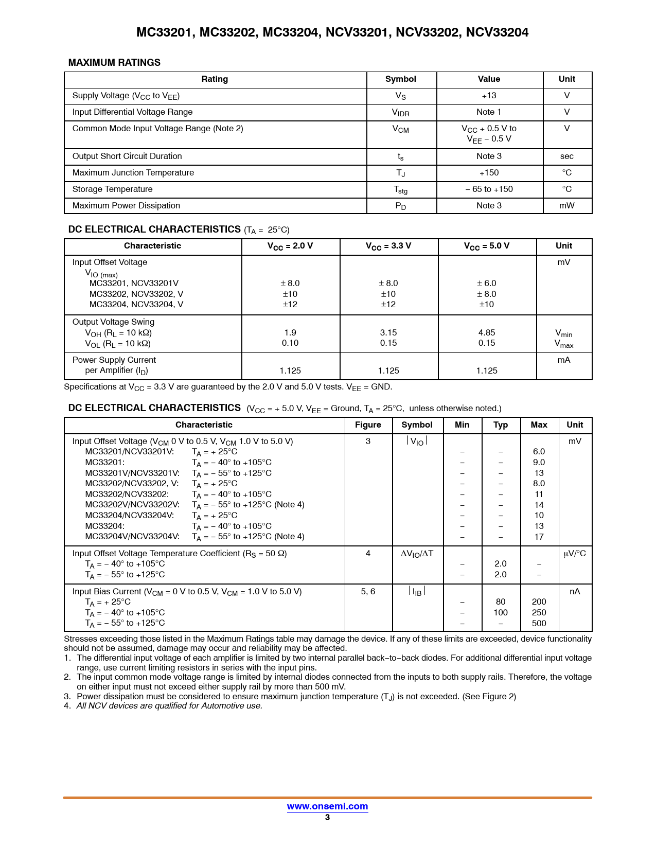 link to page 3 link to page 3 link to page 3 link to page 3 link to page 3 link to page 3 MC33201, MC33202, MC33204, NCV33201, NCV33202, NCV33204MAXIMUM RATINGSRatingSymbolValueUnit Supply Voltage (VCC to VEE) VS +13 V Input Differential Voltage Range VIDR Note 1 V Common Mode Input Voltage Range (Note 2) VCM VCC + 0.5 V to V VEE − 0.5 V Output Short Circuit Duration ts Note 3 sec Maximum Junction Temperature TJ +150 °C Storage Temperature Tstg − 65 to +150 °C Maximum Power Dissipation PD Note 3 mW DC ELECTRICAL CHARACTERISTICS (TA = 25°C) CharacteristicVCC = 2.0 VVCC = 3.3 VVCC = 5.0 VUnit Input Offset Voltage mV VIO (max) MC33201, NCV33201V ± 8.0 ± 8.0 ± 6.0 MC33202, NCV33202, V ±10 ±10 ± 8.0 MC33204, NCV33204, V ±12 ±12 ±10 Output Voltage Swing VOH (RL = 10 kW) 1.9 3.15 4.85 Vmin VOL (RL = 10 kW) 0.10 0.15 0.15 Vmax Power Supply Current mA per Amplifier (ID) 1.125 1.125 1.125 Specifications at VCC = 3.3 V are guaranteed by the 2.0 V and 5.0 V tests. VEE = GND. DC ELECTRICAL CHARACTERISTICS (VCC = + 5.0 V, VEE = Ground, TA = 25°C, unless otherwise noted.) CharacteristicFigureSymbolMinTypMaxUnit Input Offset Voltage (VCM 0 V to 0.5 V, VCM 1.0 V to 5.0 V) 3 ⎮VIO⎮ mV MC33201/NCV33201V: TA = + 25°C − − 6.0 MC33201: TA = − 40° to +105°C − − 9.0 MC33201V/NCV33201V: TA = − 55° to +125°C − − 13 MC33202/NCV33202, V: TA = + 25°C − − 8.0 MC33202/NCV33202: TA = − 40° to +105°C − − 11 MC33202V/NCV33202V: TA = − 55° to +125°C (Note 4) − − 14 MC33204/NCV33204V: TA = + 25°C − − 10 MC33204: TA = − 40° to +105°C − − 13 MC33204V/NCV33204V: TA = − 55° to +125°C (Note 4) − − 17 Input Offset Voltage Temperature Coefficient (RS = 50 W) 4 DVIO/DT mV/°C TA = − 40° to +105°C − 2.0 − TA = − 55° to +125°C − 2.0 − Input Bias Current (VCM = 0 V to 0.5 V, VCM = 1.0 V to 5.0 V) 5, 6 ⎮IIB⎮ nA TA = + 25°C − 80 200 TA = − 40° to +105°C − 100 250 TA = − 55° to +125°C − − 500 Stresses exceeding those listed in the Maximum Ratings table may damage the device. If any of these limits are exceeded, device functionality should not be assumed, damage may occur and reliability may be affected. 1. The differential input voltage of each amplifier is limited by two internal parallel back−to−back diodes. For additional differential input voltage range, use current limiting resistors in series with the input pins. 2. The input common mode voltage range is limited by internal diodes connected from the inputs to both supply rails. Therefore, the voltage on either input must not exceed either supply rail by more than 500 mV. 3. Power dissipation must be considered to ensure maximum junction temperature (TJ) is not exceeded. (See Figure 2) 4. All NCV devices are qualified for Automotive use. www.onsemi.com3