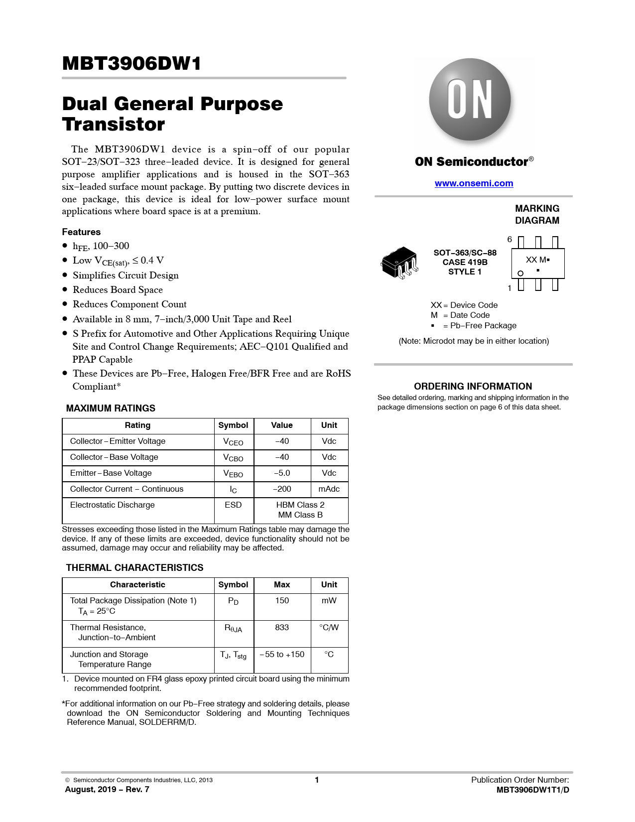 link to page 1 link to page 6 MBT3906DW1 Dual General Purpose Transistor The MBT3906DW1 device is a spin−off of our popular SOT−23/SOT−323 three−leaded device. It is designed for general purpose amplifier applications and is housed in the SOT−363 six−leaded surface mount package. By putting two discrete devices in