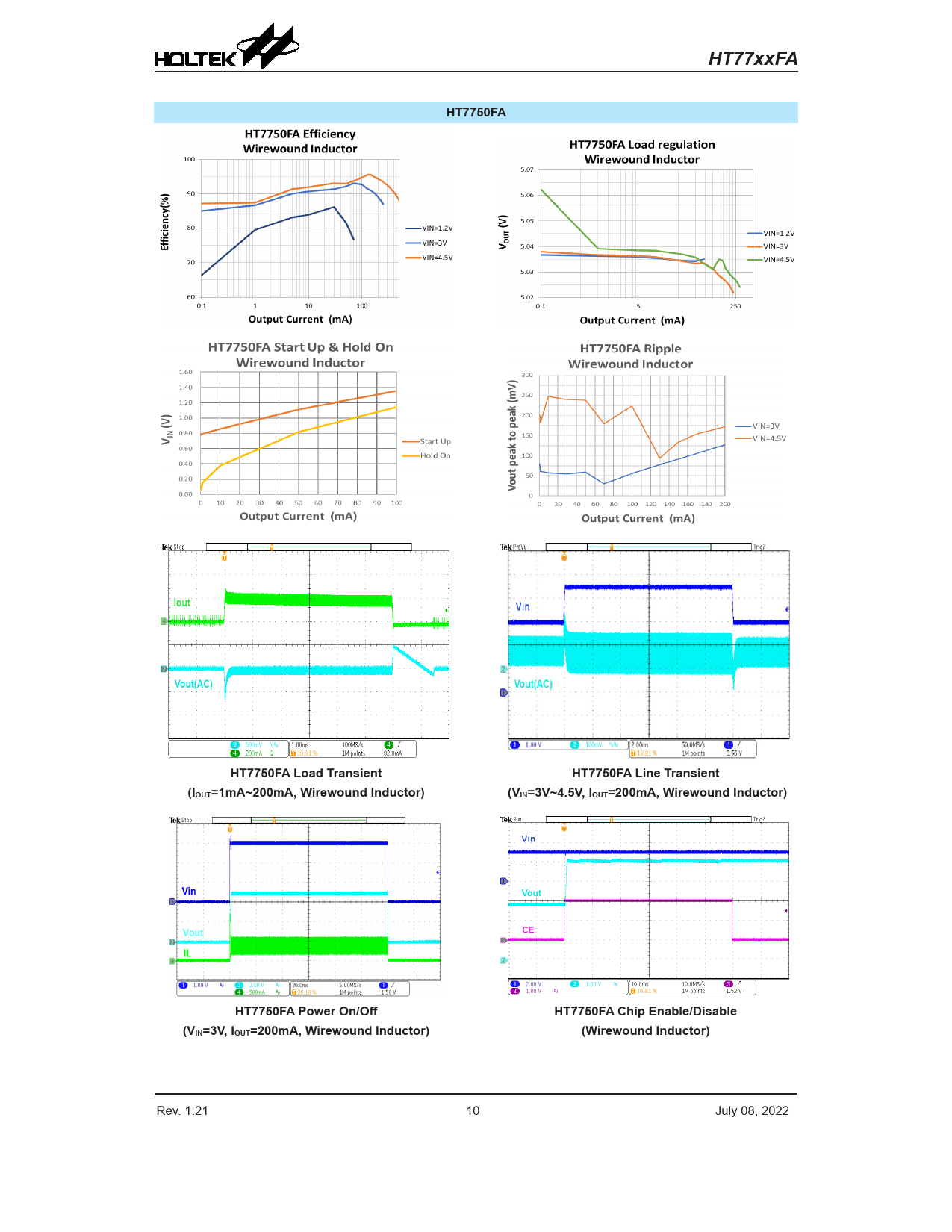 HT77xxFA. HT7750FA. HT7750FA Load Transient. HT7750FA Line Transient. (IOUT=1mA~200mA, Wirewound Inductor)