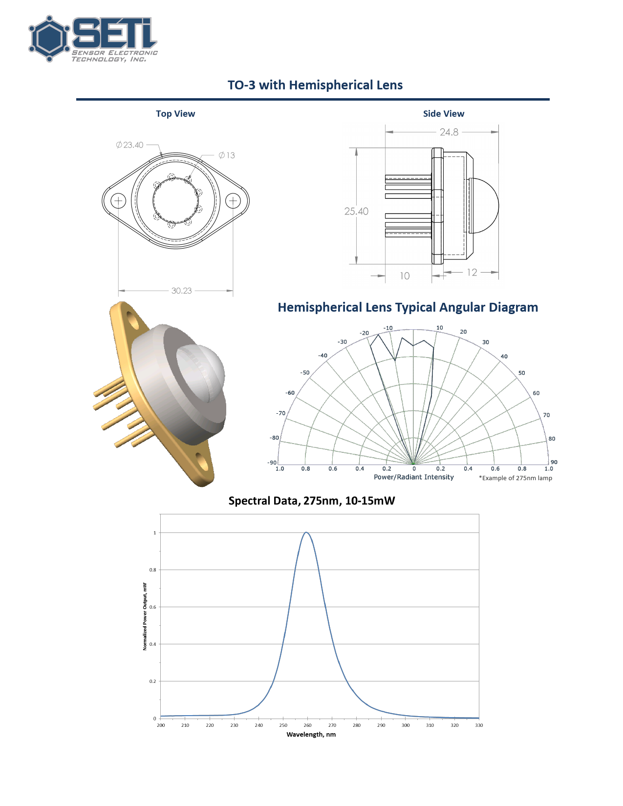 TO-3 with Hemispherical Lens. Top View. Side View. Hemispherical Lens Typical Angular Diagram