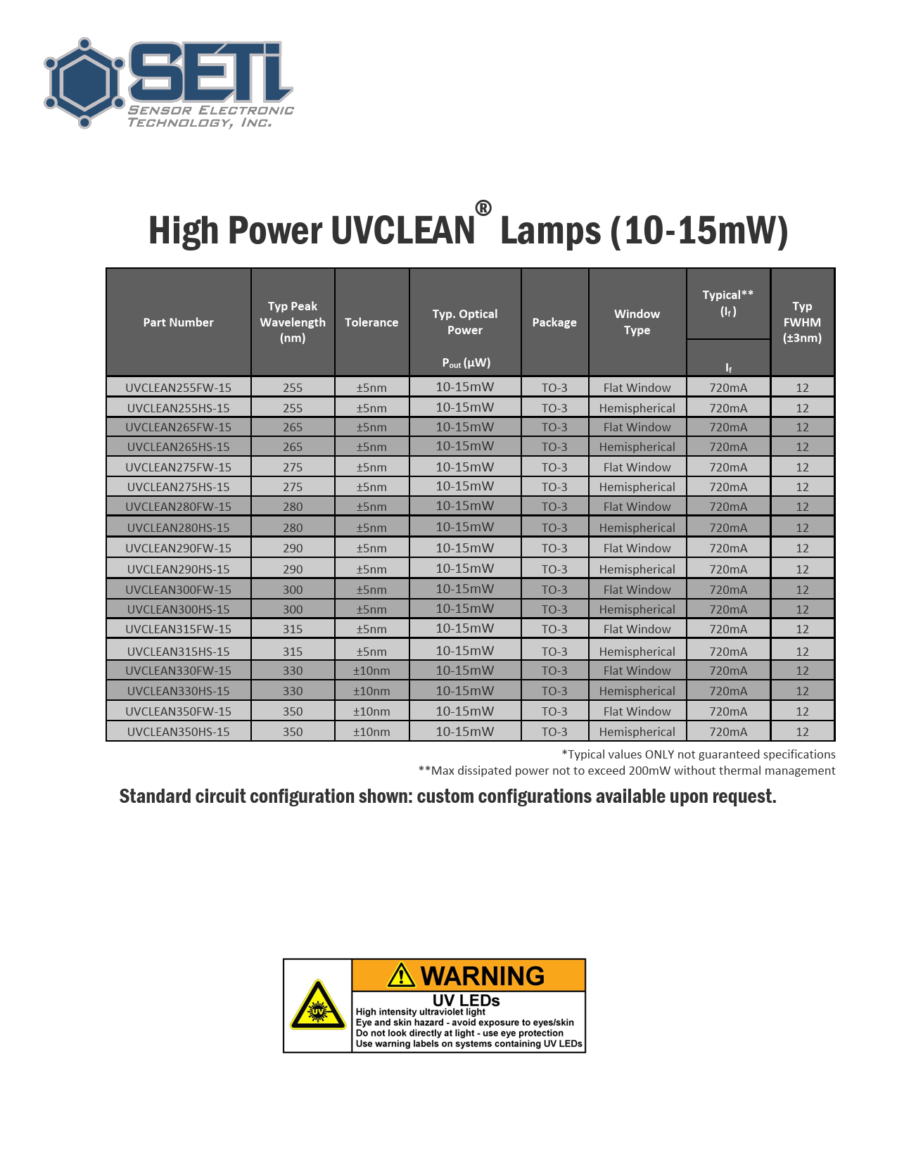 UVCLEAN255FW-15 255 ±5nm 10-15mW TO-3 Flat Window 720mA 12 UVCLEAN255HS-15 255 ±5nm 10-15mW TO-3 Hemispherical 720mA 12 UVCLEAN265FW-15 265 ±5nm 10-15mW TO-3 Flat Window 720mA 12 UVCLEAN265HS-15 265 ±5nm 10-15mW TO-3 Hemispherical 720mA 12 UVCLEAN275FW-15 275 ±5nm 10-15mW TO-3 Flat Window 720mA 12 UVCLEAN275HS-15 275 ±5nm 10-15mW TO-3 Hemispherical 720mA 12 UVCLEAN280FW-15 280 ±5nm 10-15mW TO-3 Flat Window 720mA 12 UVCLEAN280HS-15 280 ±5nm 10-15mW TO-3 Hemispherical 720mA 12 UVCLEAN290FW-15 290 ±5nm 10-15mW TO-3 Flat Window 720mA 12 UVCLEAN290HS-15 290 ±5nm 10-15mW TO-3 Hemispherical 720mA 12 UVCLEAN300FW-15 300 ±5nm 10-15mW TO-3 Flat Window 720mA 12 UVCLEAN300HS-15 300 ±5nm 10-15mW TO-3 Hemispherical 720mA 12 UVCLEAN315FW-15 315 ±5nm 10-15mW TO-3 Flat Window 720mA 12 UVCLEAN315HS-15 315 ±5nm 10-15mW TO-3 Hemispherical 720mA 12 UVCLEAN330FW-15 330 ±10nm 10-15mW TO-3 Flat Window 720mA 12 UVCLEAN330HS-15 330 ±10nm 10-15mW TO-3 Hemispherical 720mA 12 UVCLEAN350FW-15 350 ±10nm 10-15mW TO-3 Flat Window 720mA 12 UVCLEAN350HS-15 350 ±10nm 10-15mW TO-3 Hemispherical 720mA 12 *Typical values ONLY not guaranteed specifications **Max dissipated power not to exceed 200mW without thermal management Standard circuit configuration shown: custom configurations available upon request.