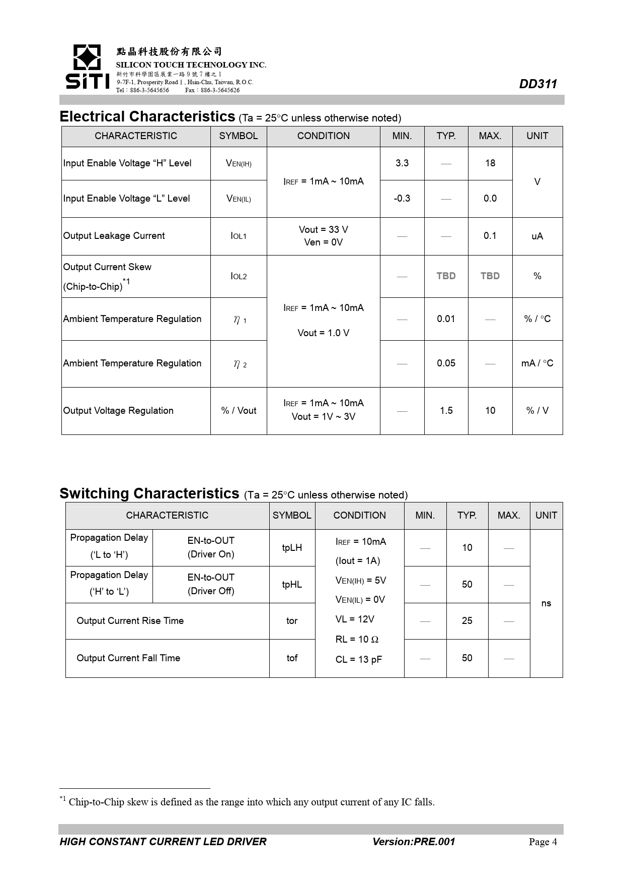 SILICON TOUCH TECHNOLOGY INC. DD311. Electrical Characteristics. TBD. Switching Characteristics. HIGH CONSTANT CURRENT LED DRIVER