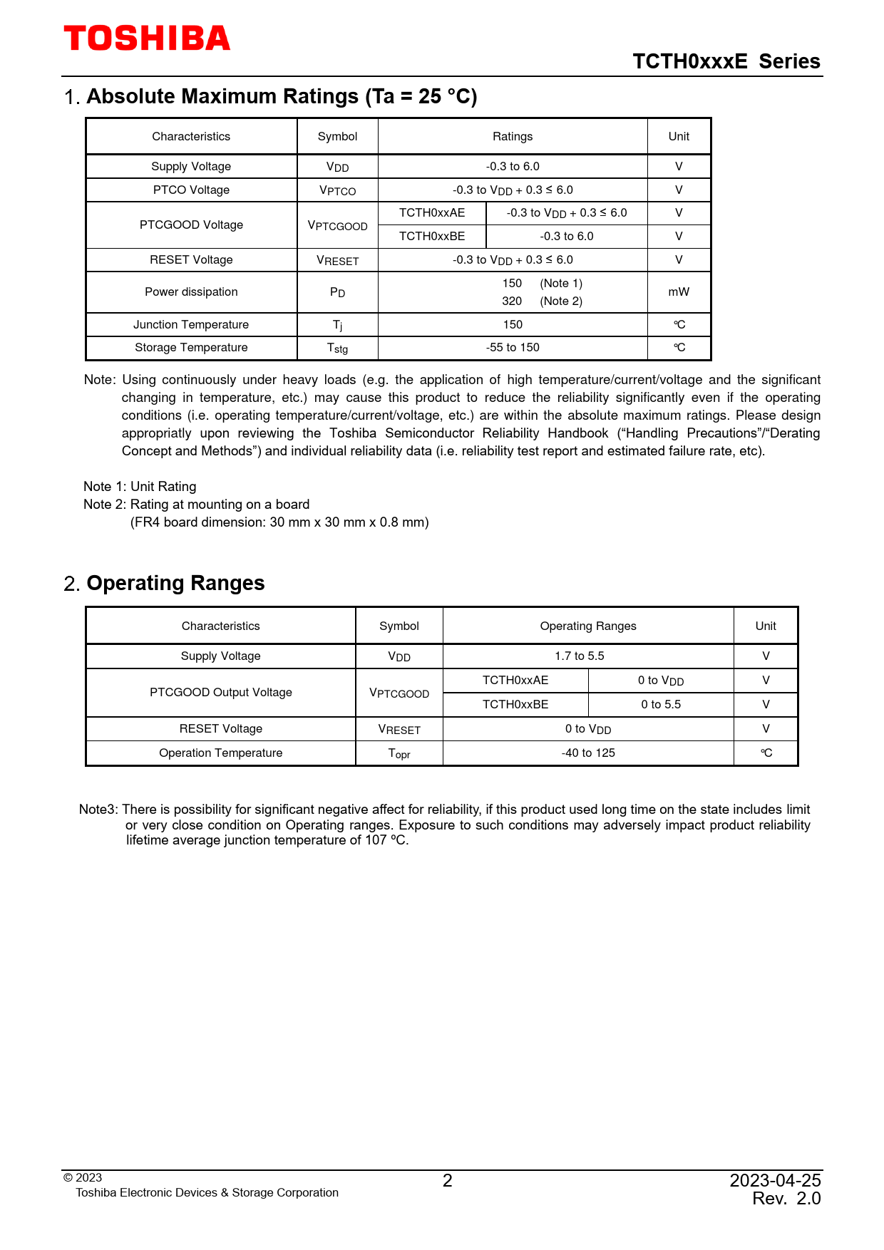 Characteristics Symbol Operating Ranges Unit Supply Voltage VDD 1.7 to 5.5 V TCTH0xxAE 0 to VDD V PTCGOOD Output Voltage VPTCGOOD TCTH0xxBE 0 to 5.5 V RESET Voltage VRESET 0 to VDD V Operation Temperature Topr -40 to 125 °C Note3: There is possibility for significant negative affect for reliability, if this product used long time on the state includes limit or very close condition on Operating ranges. Exposure to such conditions may adversely impact product reliability lifetime average junction temperature of 107 ºC. © 2023 2 2023-04-25 Toshiba Electronic Devices & Storage Corporation Rev. 2.0
