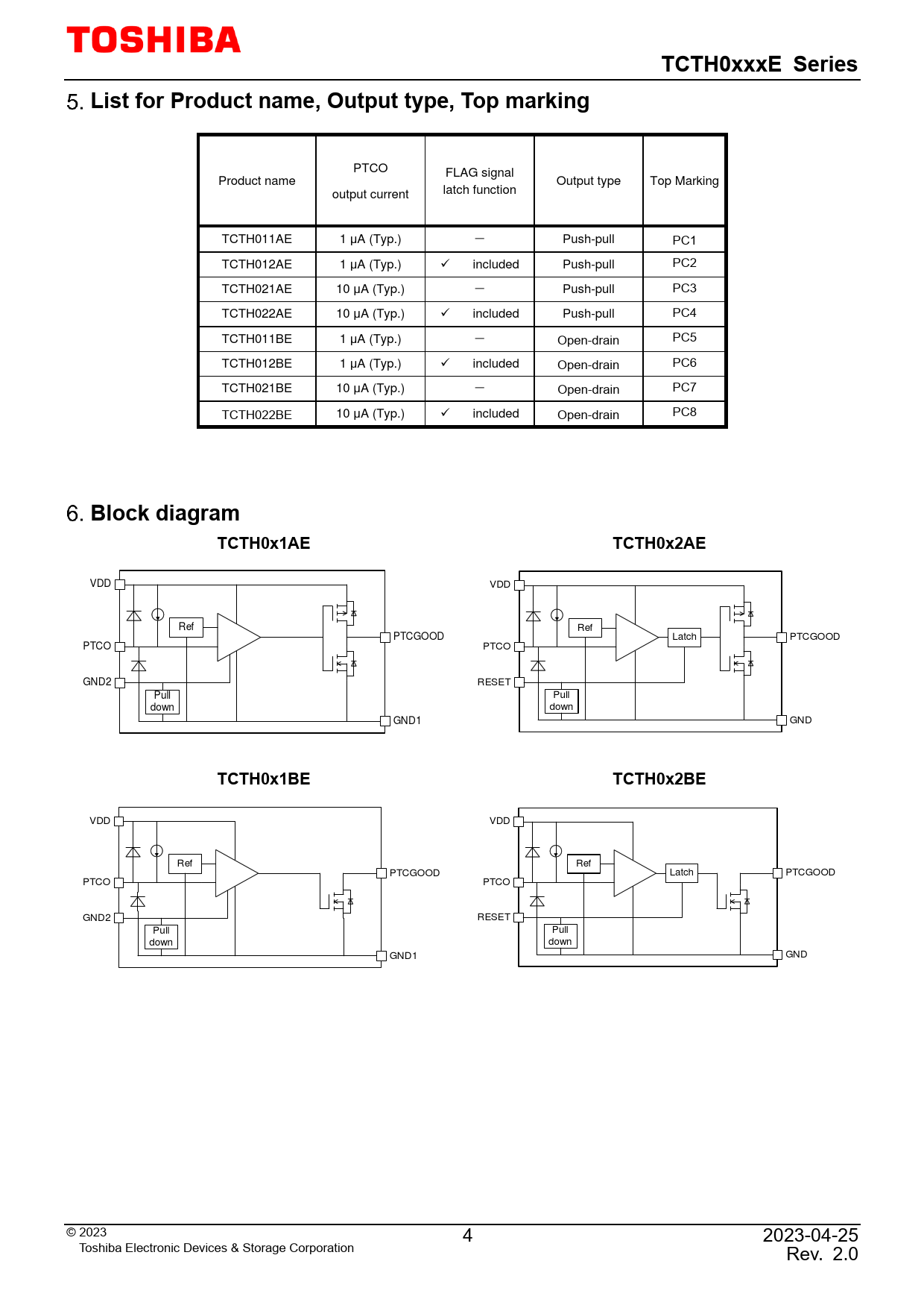 PTCO FLAG signal Product name Output type Top Marking output current latch function TCTH011AE 1 μA (Typ.) - Push-pull PC1 TCTH012AE 1 μA (Typ.) ✓ included Push-pull PC2 TCTH021AE 10 μA (Typ.) - Push-pull PC3 TCTH022AE 10 μA (Typ.) ✓ included Push-pull PC4 TCTH011BE 1 μA (Typ.) - Open-drain PC5 TCTH012BE 1 μA (Typ.) ✓ included Open-drain PC6 TCTH021BE 10 μA (Typ.) - Open-drain PC7 TCTH022BE 10 μA (Typ.) ✓ included Open-drain PC8