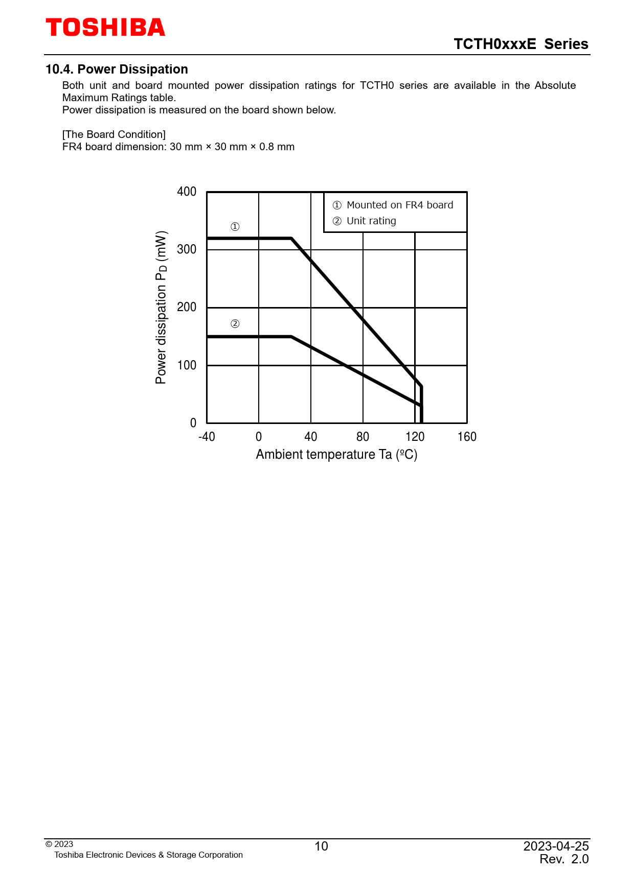 Both unit and board mounted power dissipation ratings for TCTH0 series are available in the Absolute Maximum Ratings table. Power dissipation is measured on the board shown below. [The Board Condition] FR4 board dimension: 30 mm × 30 mm × 0.8 mm 400 ① Mounted on FR4 board ② Unit rating ① ) W 300 (m DPn tio a 200 p ② issi r d e w 100 o P 0 -40 0 40 80 120 160 Ambient temperature Ta (ºC) © 2023 10 2023-04-25 Toshiba Electronic Devices & Storage Corporation Rev. 2.0