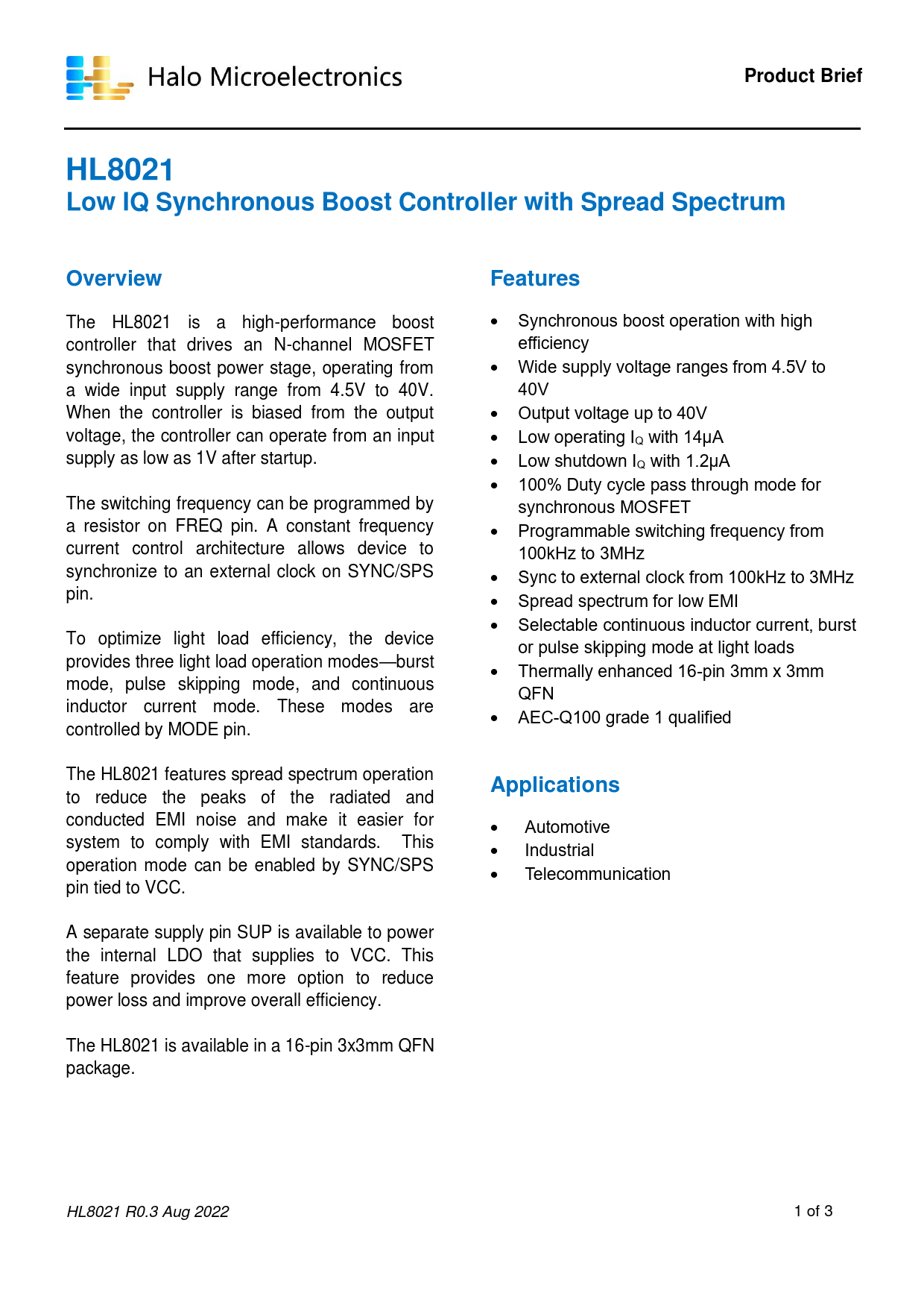 页数 / 页3 / 1 — Product Brief. HL8021 Low IQ Synchronous Boost Controller with Spread …