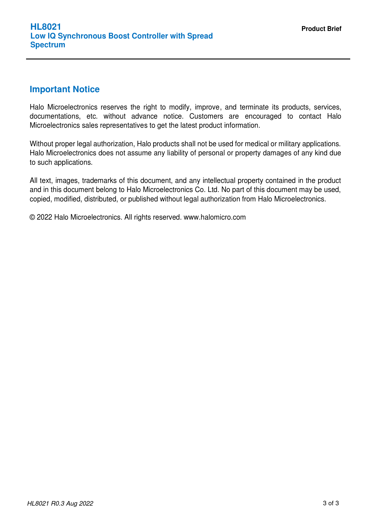 Halo Microelectronics reserves the right to modify, improve, and terminate its products, services, documentations, etc. without advance notice. Customers are encouraged to contact Halo Microelectronics sales representatives to get the latest product information. Without proper legal authorization, Halo products shall not be used for medical or military applications. Halo Microelectronics does not assume any liability of personal or property damages of any kind due to such applications. All text, images, trademarks of this document, and any intellectual property contained in the product and in this document belong to Halo Microelectronics Co. Ltd. No part of this document may be used, copied, modified, distributed, or published without legal authorization from Halo Microelectronics. © 2022 Halo Microelectronics. All rights reserved. www.halomicro.com HL8021 R0.3 Aug 2022 3 of 3