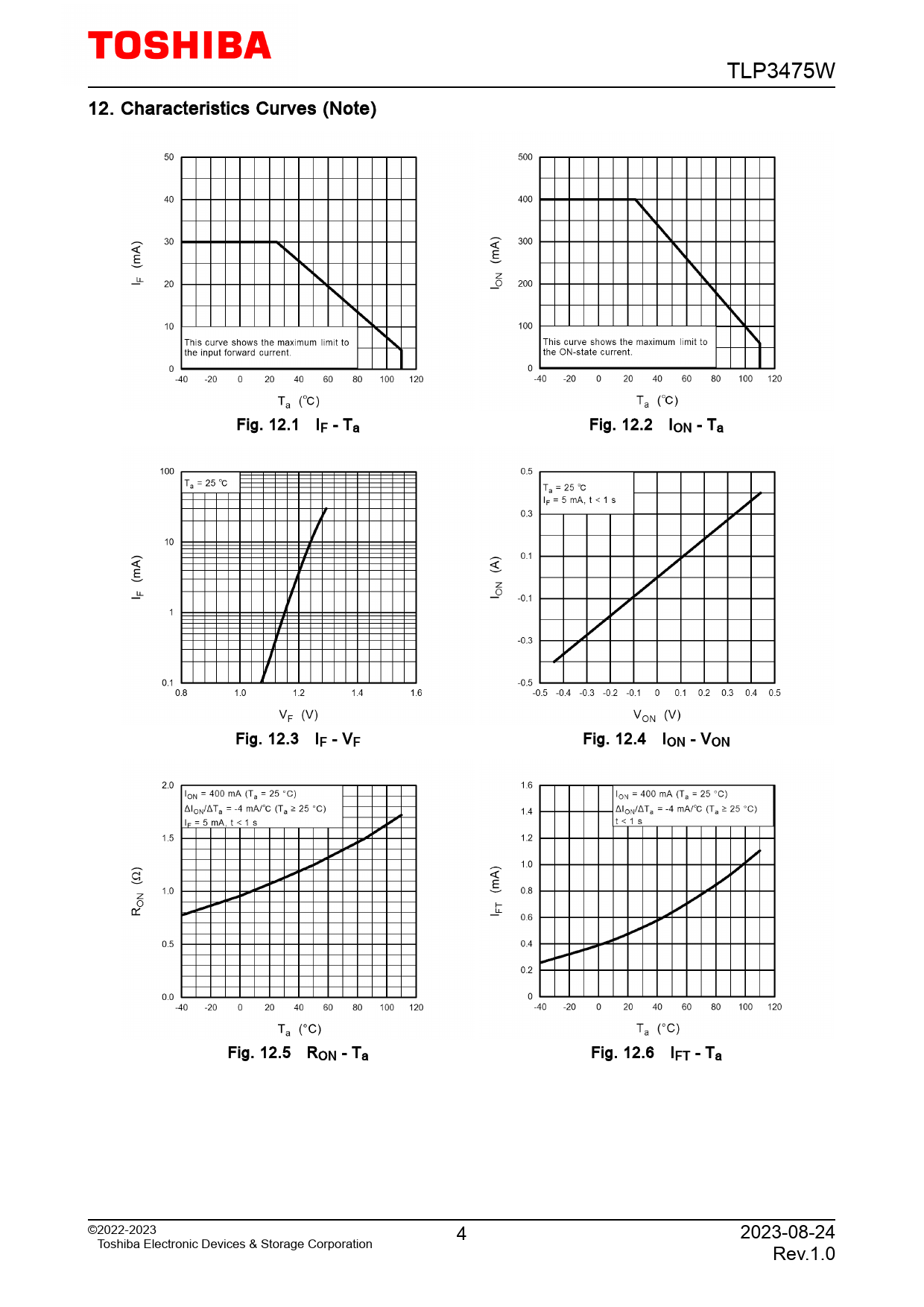 TLP3475W 12. Characteristics Curves (Note) Fig. 12.1 IF - Ta Fig. 12.2 ION - Ta Fig. 12.3 IF - VF Fig. 12.4 ION - VON Fig. 12.5 RON - Ta Fig. 12.6 IFT - Ta ©2022-2023 4 2023-08-24 Toshiba Electronic Devices & Storage Corporation Rev.1.0