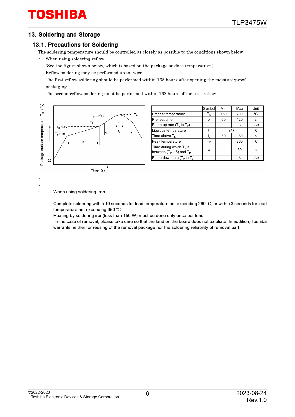 TLP3475W 13. Soldering and Storage 13.1. Precautions for Soldering The soldering temperature should be controlled as closely as possible to the conditions shown below. • When using soldering reflow (See the figure shown below, which is based on the package surface temperature.) Reflow soldering may be performed up to twice. The first reflow soldering should be performed within 168 hours after opening the moisture-proof packaging. The second reflow soldering must be performed within 168 hours of the first reflow. • • :: When using soldering Iron Complete soldering within 10 seconds for lead temperature not exceeding 260 �, or within 3 seconds for lead temperature not exceeding 350 �. Heating by soldering iron(less than 150 W) must be done only once per lead. In the case of removal, please take care so that the land on the board does not exfoliate. In addition, Toshiba warrants neither for reusing of the removal package nor the soldering reliability of removal part. ©2022-2023 6 2023-08-24 Toshiba Electronic Devices & Storage Corporation Rev.1.0