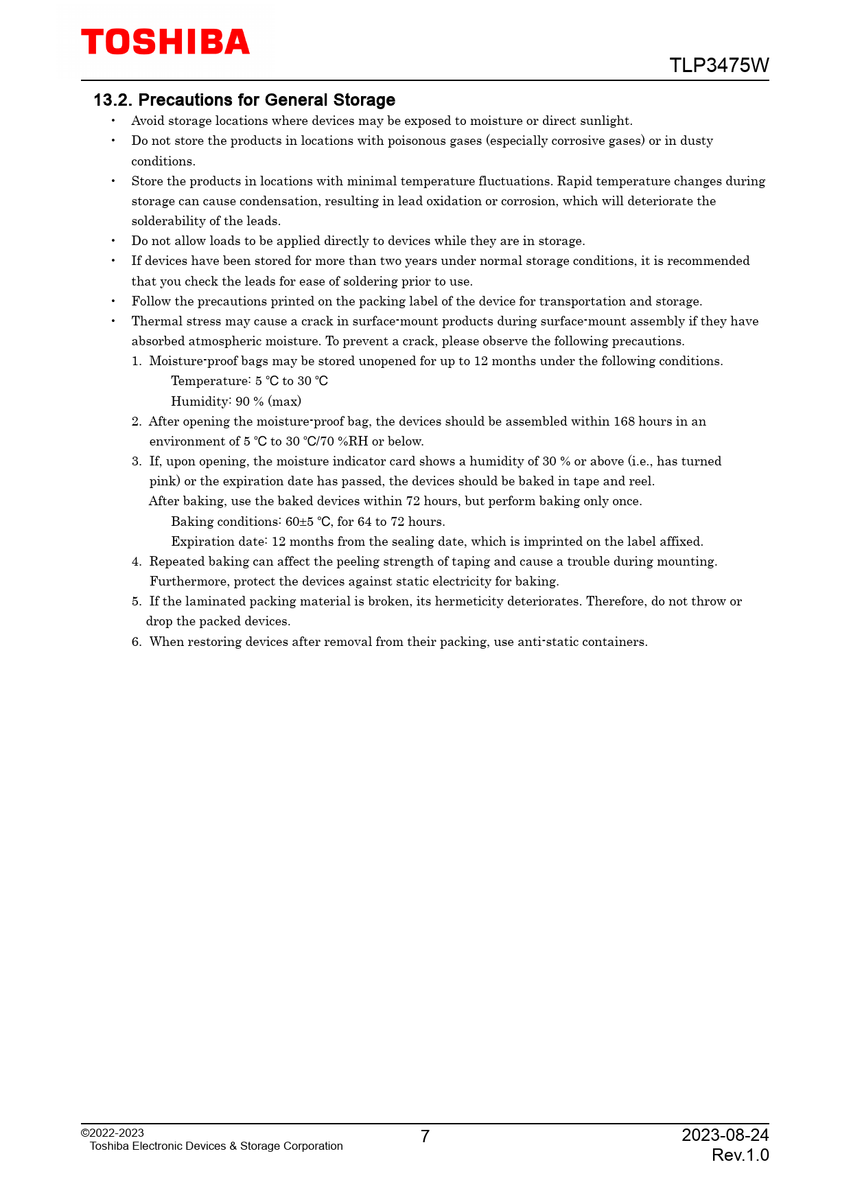 | 页数 / 页 | 11 / 7 — TLP3475W. 13.2. Precautions. for. General. Storage. •. Avoid. storage. … |