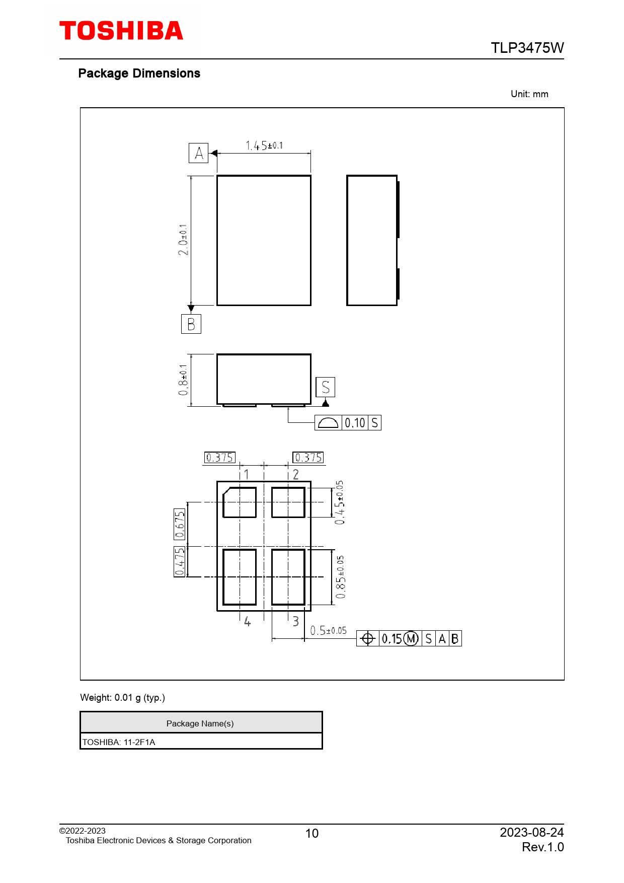 TLP3475W. Package. Dimensions. Unit:. mm. Weight:. 0.01. g. (typ.). Package. Name(s). TOSHIBA:. 11-2F1A. ©2022-2023. 10. 2023-08-24. Toshiba. Electronic