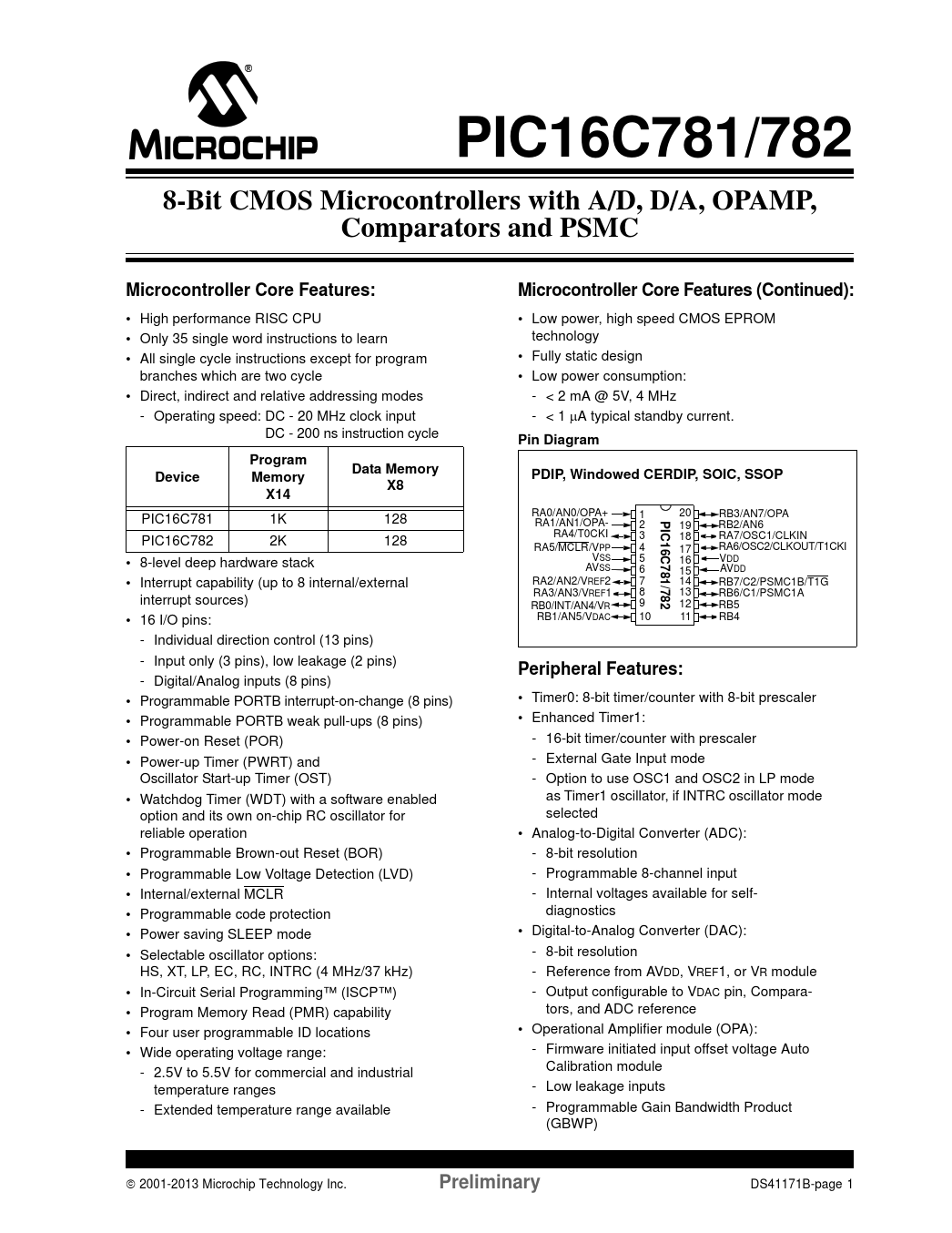 PIC16C781/782. 8-Bit CMOS Microcontrollers with A/D, D/A, OPAMP,. Comparators and PSMC. Microcontroller Core Features: