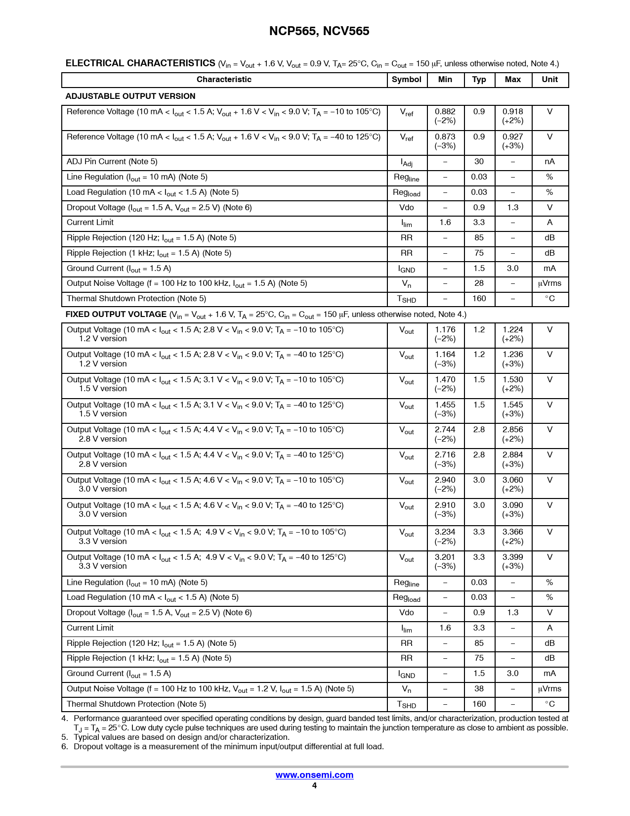 NCP565, NCV565 ELECTRICAL CHARACTERISTICS Characteristic Symbol Min Typ Max Unit ADJUSTABLE OUTPUT VERSION FIXED OUTPUT VOLTAGE