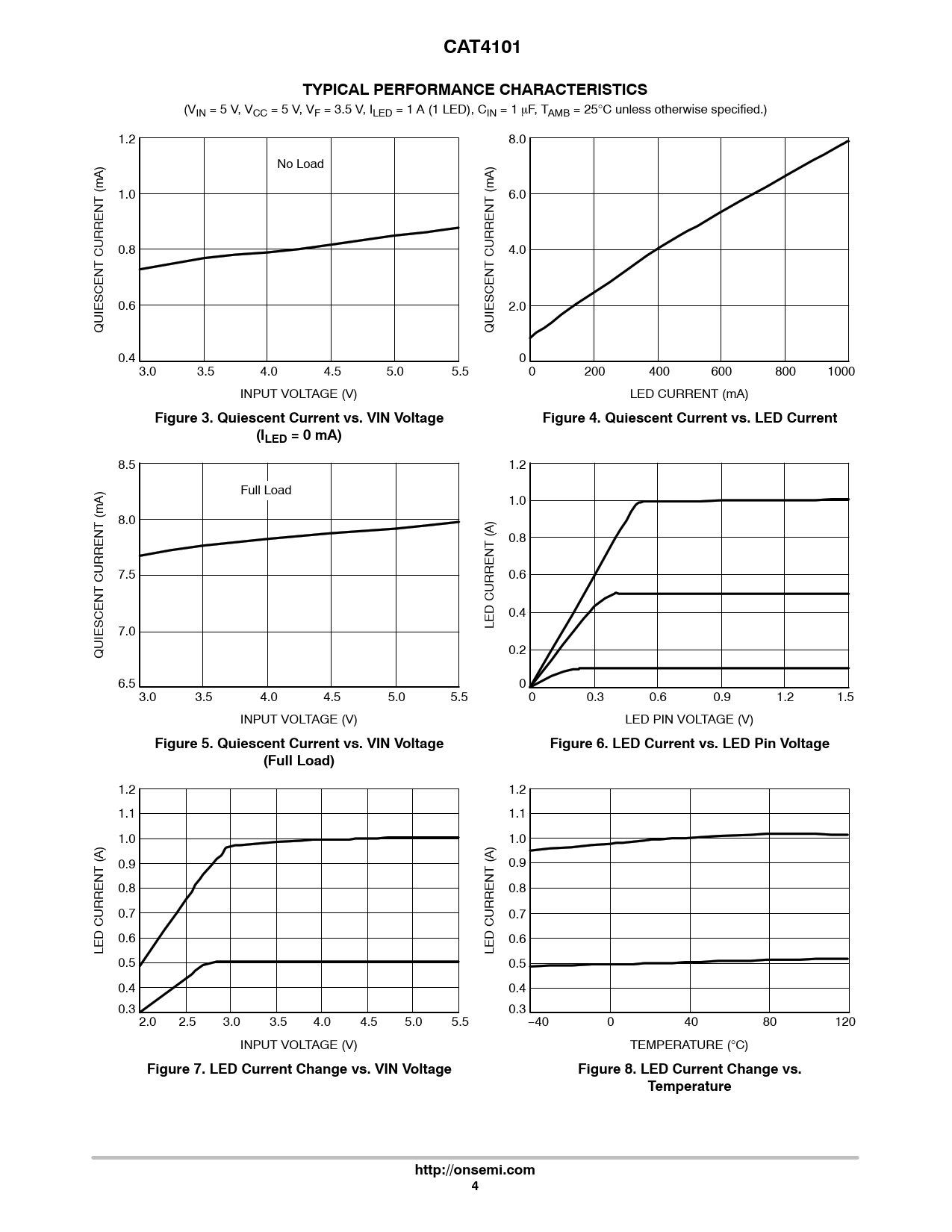 (VIN = 5 V, VCC = 5 V, VF = 3.5 V, ILED = 1 A (1 LED), CIN = 1 mF, TAMB = 25°C unless otherwise specified.) 1.2 8.0 No Load 1.0 6.0 0.8 4.0 0.6 2.0 QUIESCENT CURRENT (mA) QUIESCENT CURRENT (mA) 0.4 0 3.0 3.5 4.0 4.5 5.0 5.5 0 200 400 600 800 1000 INPUT VOLTAGE (V) LED CURRENT (mA)