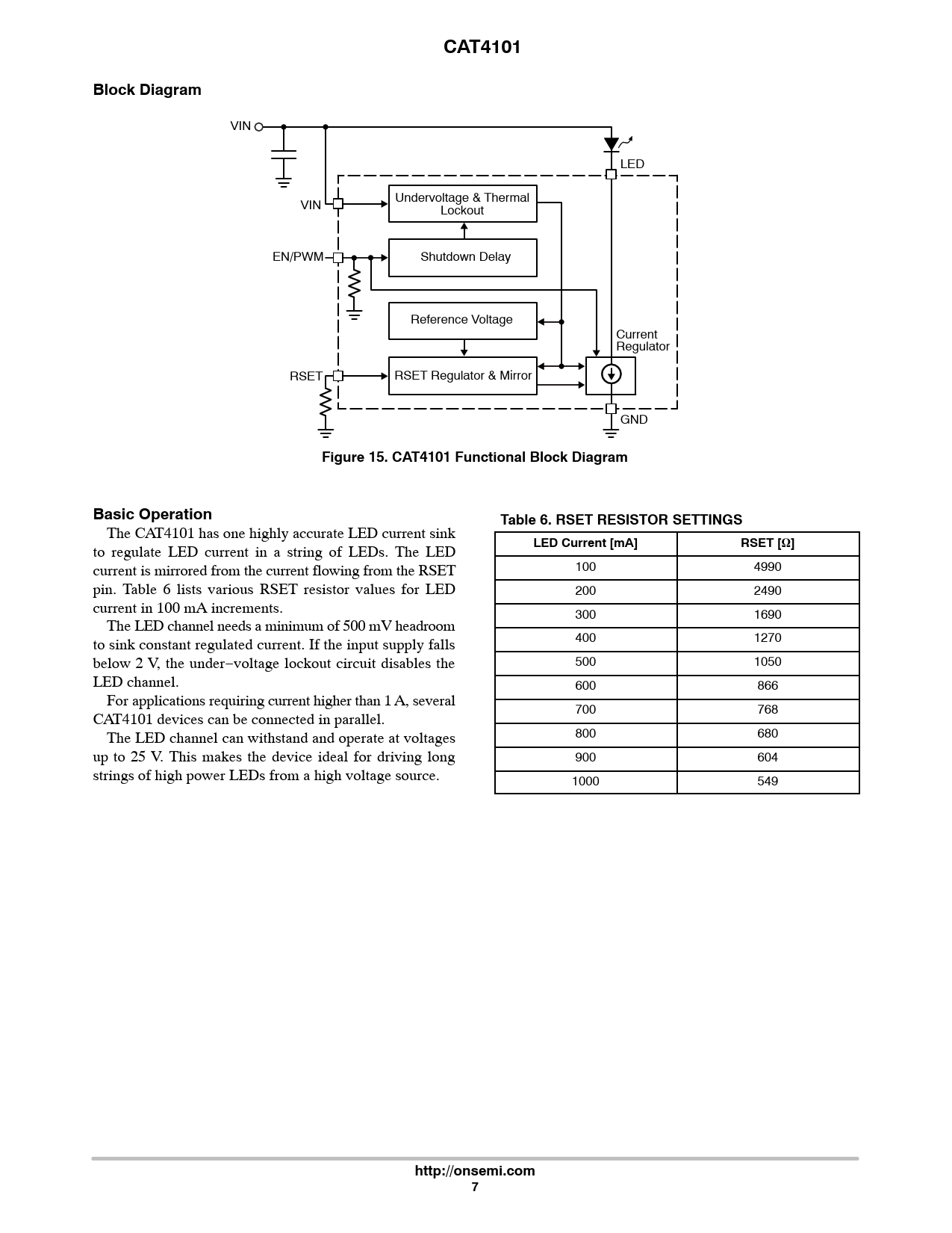 CAT4101. Block Diagram. Figure 15. CAT4101 Functional Block Diagram. Basic Operation. Table 6. RSET RESISTOR SETTINGS