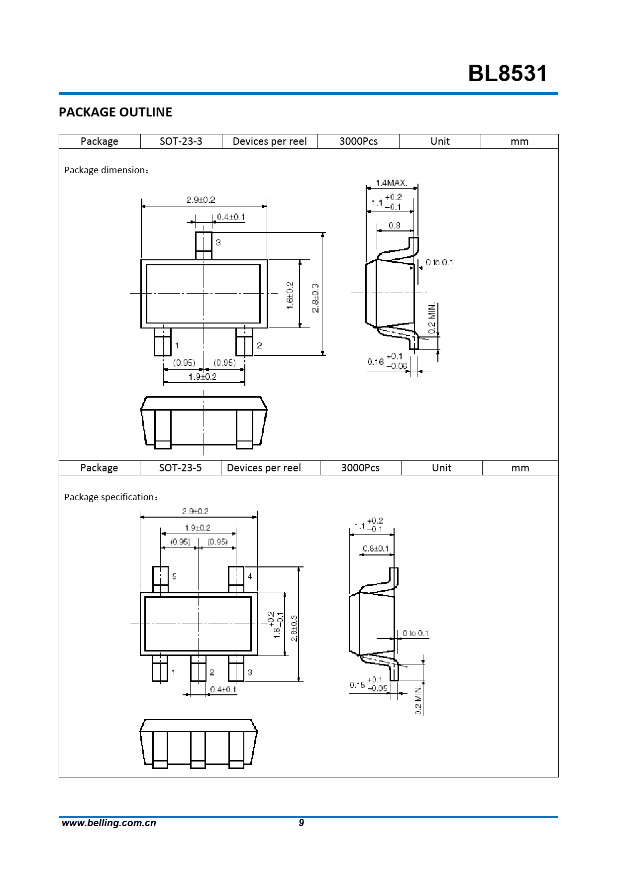 BL8531. PACKAGE. OUTLINE. Package. SOT-23-3. Devices. per. reel. 3000Pcs. Unit. mm. Package. dimension:. Package. SOT-23-5. Devices. per. reel. 3000Pcs. Unit