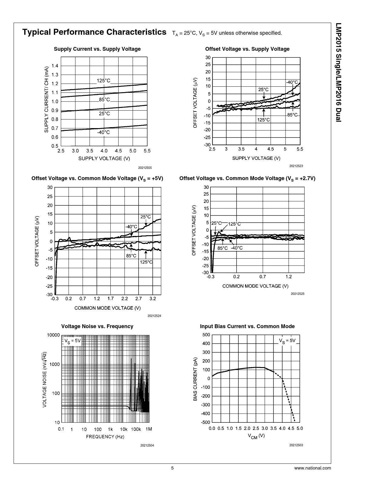 LMP2015 Single/LMP2016 DualTypical Performance Characteristics T = 25°C, V = 5V unless otherwise specified. A S Supply Current vs. Supply VoltageOffset Voltage vs. Supply Voltage 20212523 20212555 Offset Voltage vs. Common Mode Voltage (V = +5V)Offset Voltage vs. Common Mode Voltage (V = +2.7V)SS 20212525 20212524 Voltage Noise vs. FrequencyInput Bias Current vs. Common Mode 20212504 20212503 5 www.national.com Document Outline LMP2015 Single/LMP2016 Dual General Description Features Applications Connection Diagrams Ordering Information Absolute Maximum Ratings Operating Ratings 2.7V DC Electrical Characteristics 2.7V AC Electrical Characteristics 5V DC Electrical Characteristics 5V AC Electrical Characteristics Typical Performance Characteristics Application Information THE BENEFITS OF THE LMP2015/LMP2016'sNO 1/f NOISE OVERLOAD RECOVERY FIGURE 1. Overload Recovery Test NO EXTERNAL CAPACITORS REQUIRED MORE BENEFITS HOW THE LMP2015/LMP2016 WORK FIGURE 2. The Output of a Chopper Stabilized Op Amp (MAX432) FIGURE 3. The Output of the LMP2015/LMP2016 INPUT CURRENTS PRECISION STRAIN GAUGE AMPLIFIER FIGURE 4. Precision Strain Gauge Amplifier FIGURE 5. Composite Amplifier Configuration TABLE 1. Composite Amplifier Measured Performance FIGURE 6. Composite Amplifier Configuration FIGURE 7. AC Coupled ADC Driver LMP2015 AS AN ADC DRIVER FIGURE 8. DC Coupled ADC Driver Physical Dimensions