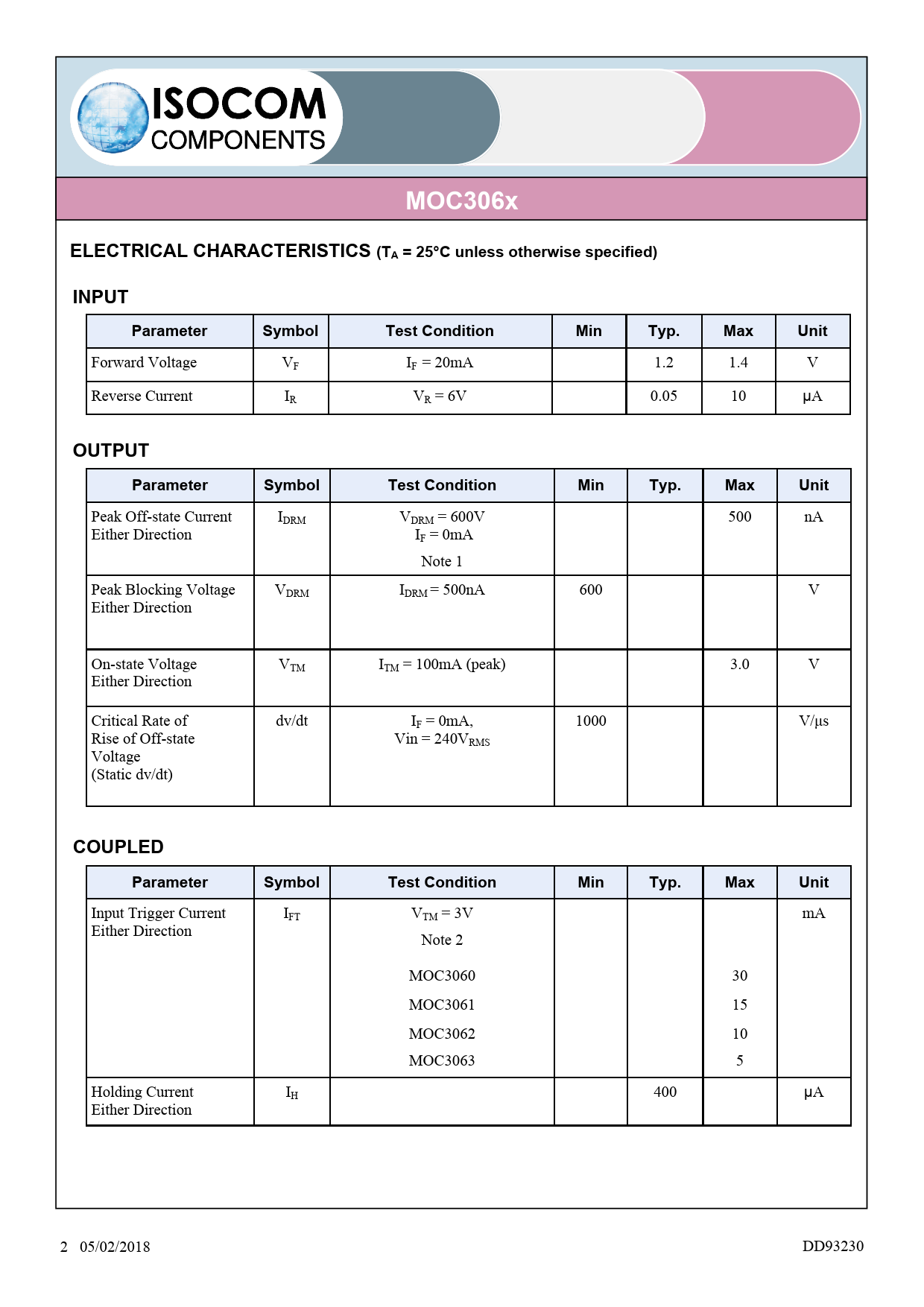 Input Trigger Current I mA FT VTM = 3V Either Direction Note 2 MOC3060 30 MOC3061 15 MOC3062 10 MOC3063 5 Holding Current IH 400 μA Either Direction 2 05/02/2018 DD93230