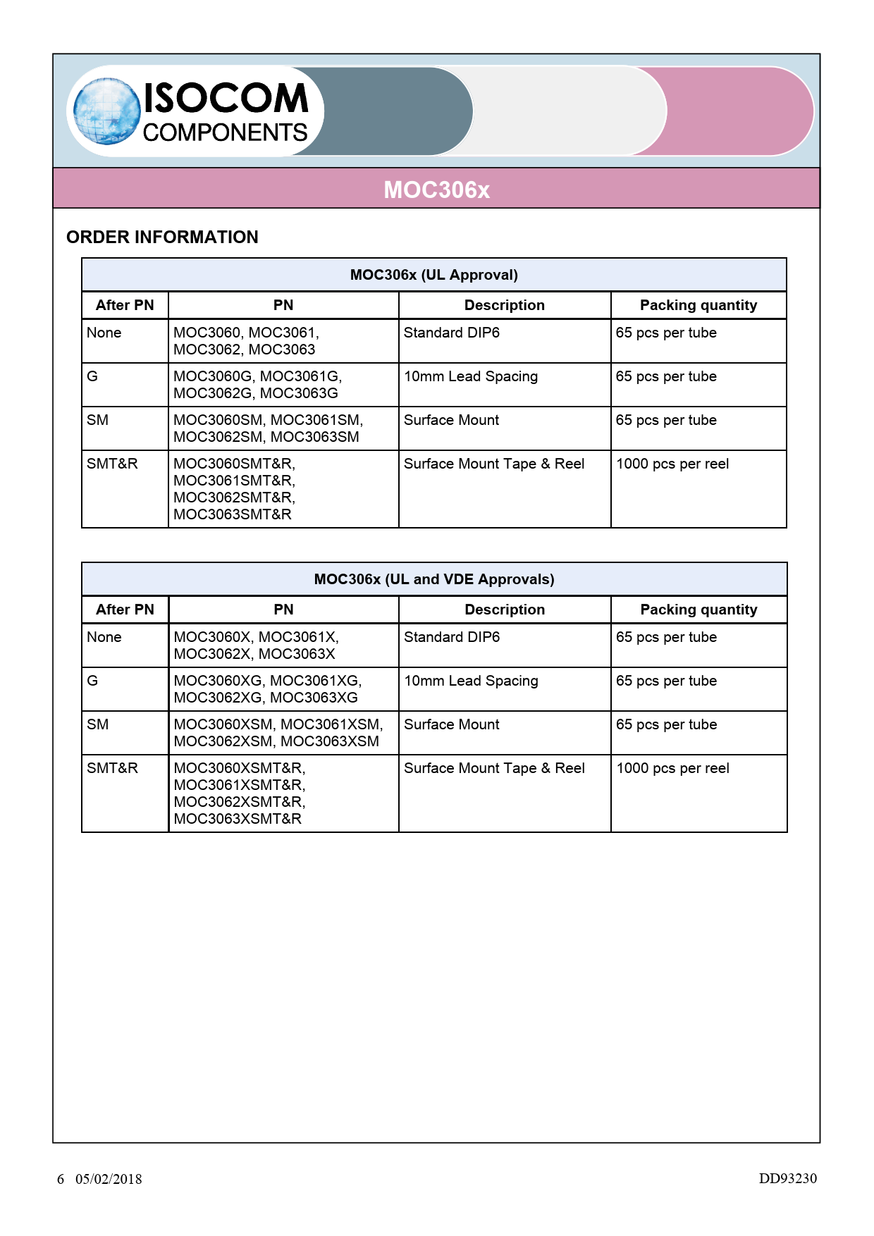 MOC306x. ORDER INFORMATION. MOC306x (UL Approval). After PN. Description. Packing quantity. MOC306x (UL and VDE Approvals)