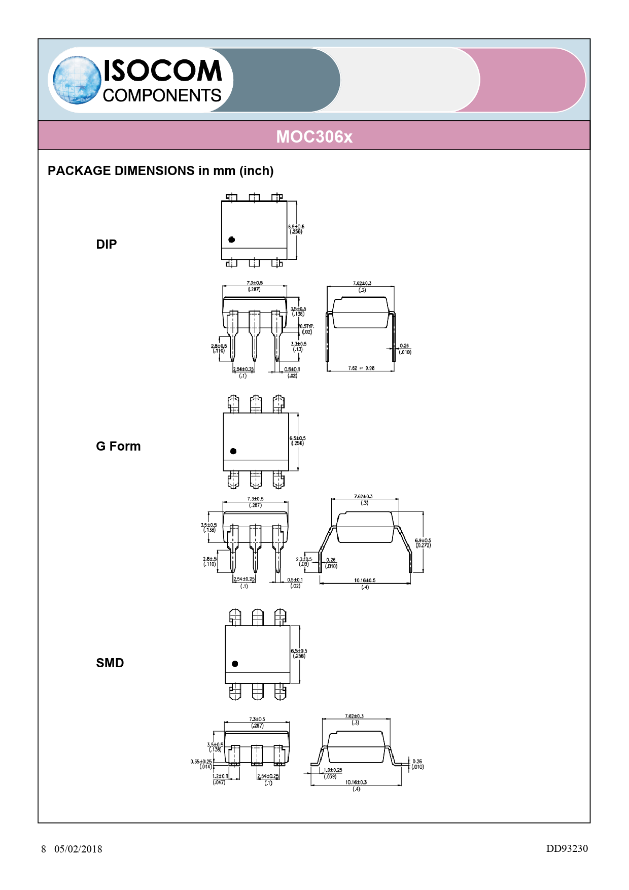 | 页数 / 页 | 11 / 8 — MOC306x. PACKAGE DIMENSIONS in mm (inch). DIP. G Form. SMD |