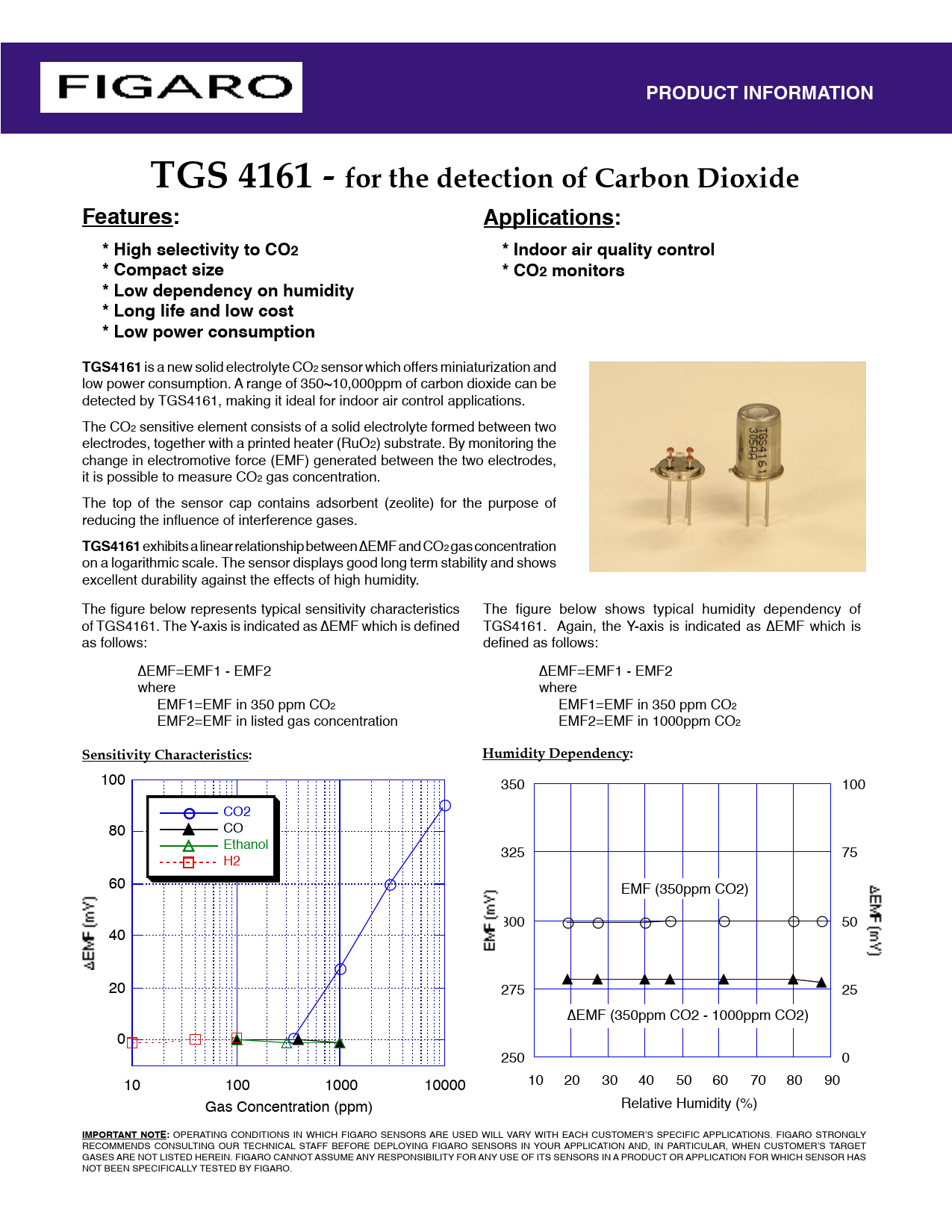 PRODUCT INFORMATION. PRODUCT INFORMA. TGS 4161 - for the detection of Carbon Dioxide. Features:. Applications: