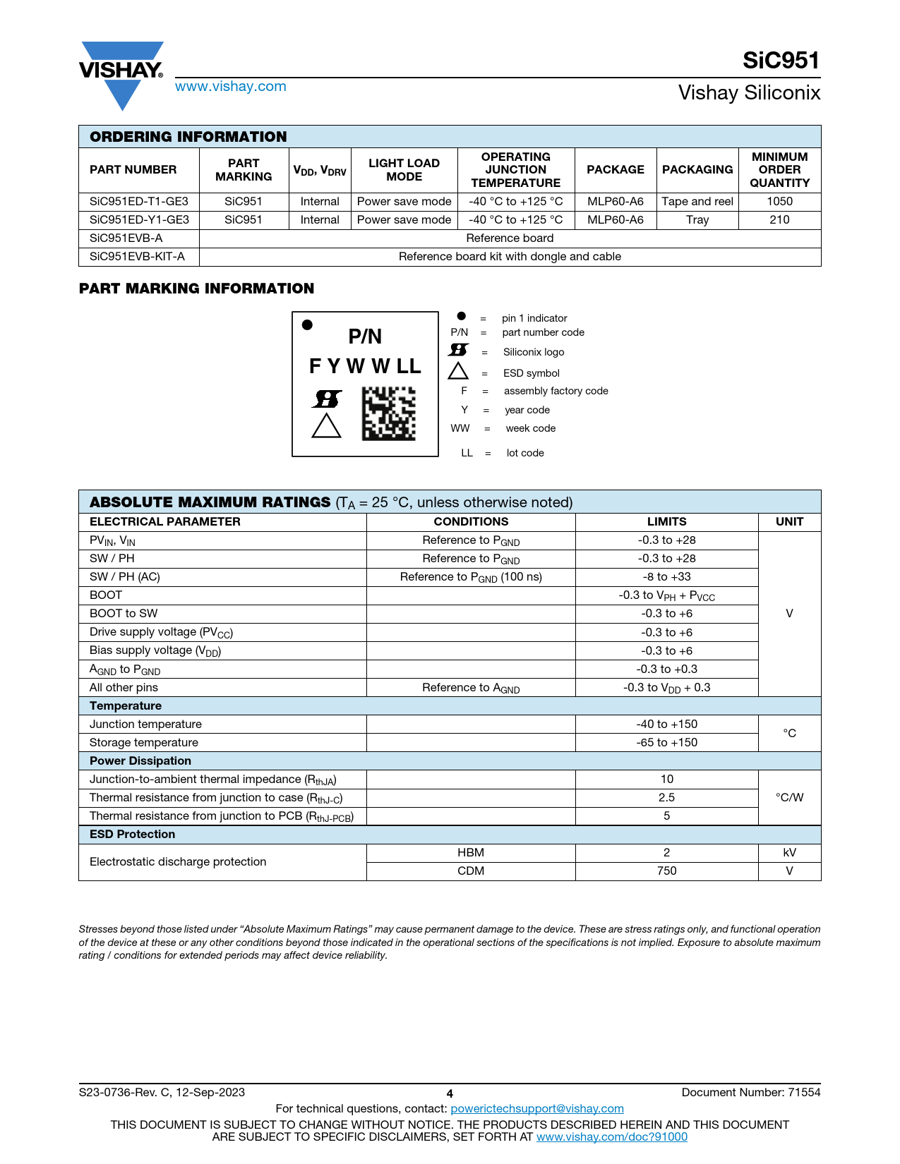 SiC951ED-T1-GE3 SiC951 Internal Power save mode -40 °C to +125 °C MLP60-A6 Tape and reel 1050 SiC951ED-Y1-GE3 SiC951 Internal Power save mode -40 °C to +125 °C MLP60-A6 Tray 210 SiC951EVB-A Reference board SiC951EVB-KIT-A Reference board kit with dongle and cable