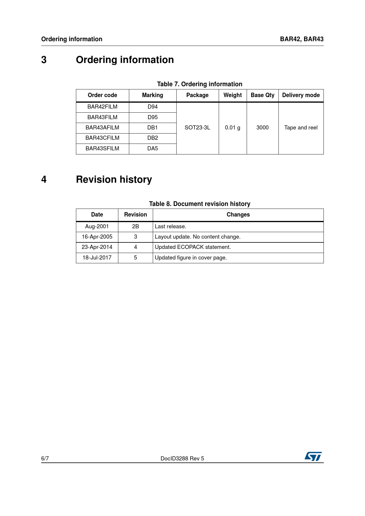 Ordering information. BAR42, BAR43. 3 Ordering. information. Table 7. Ordering information. Order code. Marking. Package. Weight