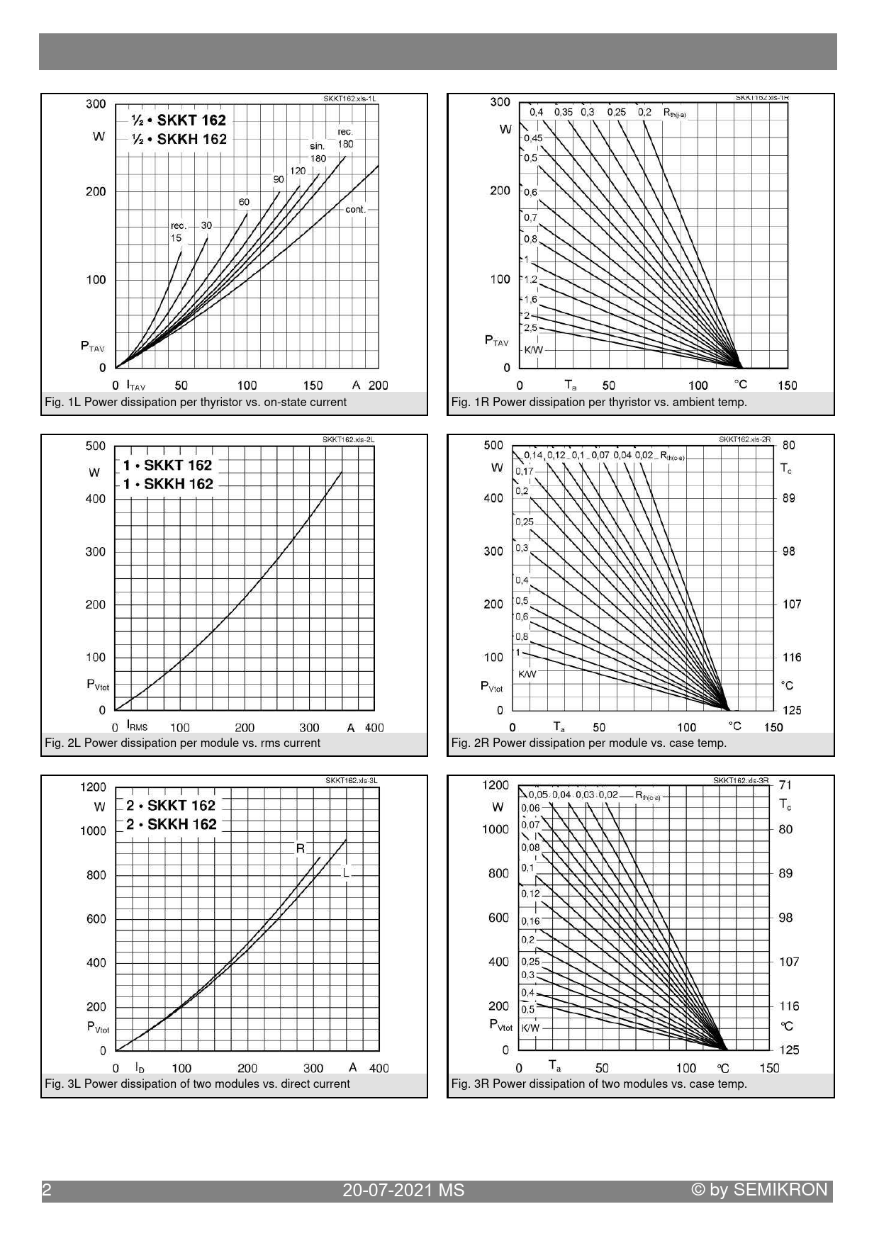 Fig. 1L Power dissipation per thyristor vs. on-state current Fig. 1R Power dissipation per thyristor vs. ambient temp. Fig. 2L Power dissipation per module vs. rms current Fig. 2R Power dissipation per module vs. case temp. Fig. 3L Power dissipation of two modules vs. direct current Fig. 3R Power dissipation of two modules vs. case temp. 2 20-07-2021 MS © by SEMIKRON
