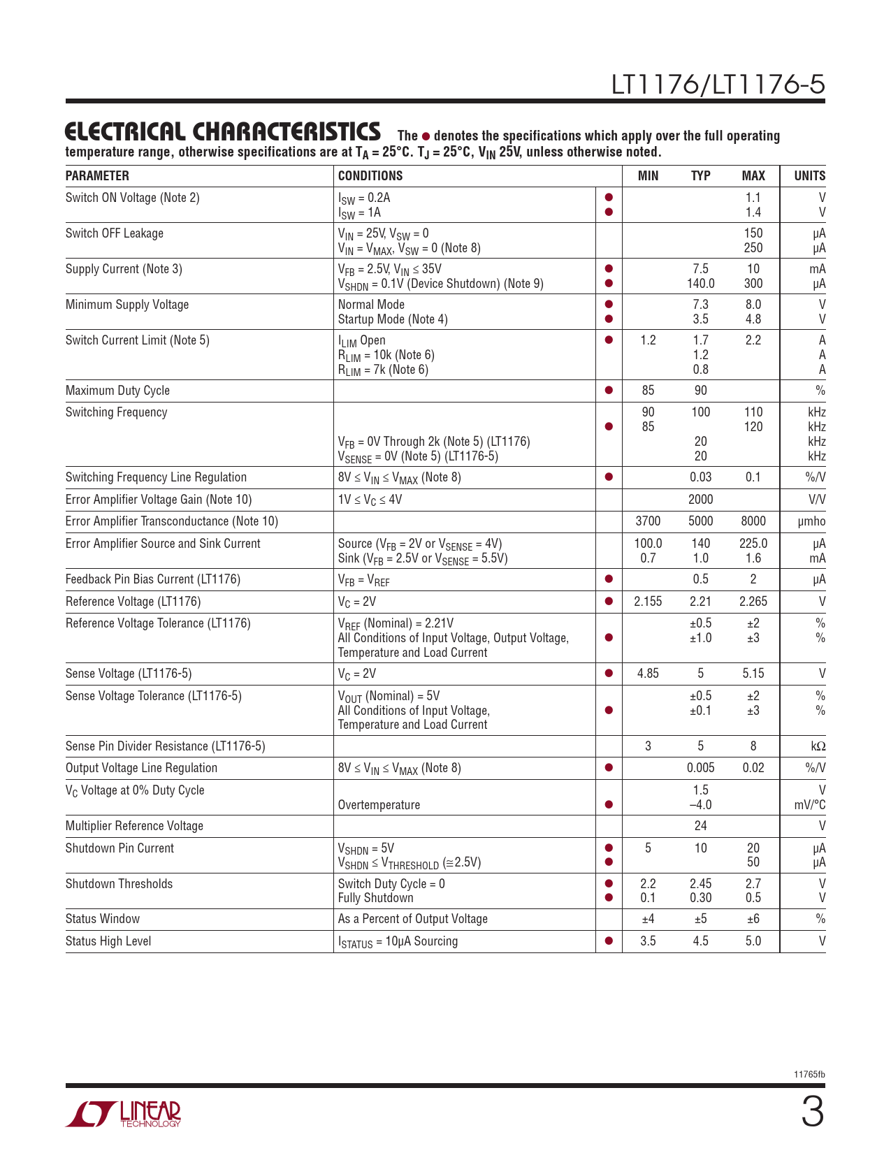 LT1176/LT1176-5 ELECTRICAL CHARACTERISTICSThe l denotes the specifications which apply over the full operatingtemperature range, otherwise specifications are at TA = 25°C. TJ = 25°C, VIN 25V, unless otherwise noted. PARAMETERCONDITIONSMINTYPMAXUNITS Switch ON Voltage (Note 2) ISW = 0.2A l 1.1 V ISW = 1A l 1.4 V Switch OFF Leakage VIN = 25V, VSW = 0 150 µA VIN = VMAX, VSW = 0 (Note 8) 250 µA Supply Current (Note 3) VFB = 2.5V, VIN ≤ 35V l 7.5 10 mA VSHDN = 0.1V (Device Shutdown) (Note 9) l 140.0 300 µA Minimum Supply Voltage Normal Mode l 7.3 8.0 V Startup Mode (Note 4) l 3.5 4.8 V Switch Current Limit (Note 5) ILIM Open l 1.2 1.7 2.2 A RLIM = 10k (Note 6) 1.2 A RLIM = 7k (Note 6) 0.8 A Maximum Duty Cycle l 85 90 % Switching Frequency 90 100 110 kHz l 85 120 kHz VFB = 0V Through 2k (Note 5) (LT1176) 20 kHz VSENSE = 0V (Note 5) (LT1176-5) 20 kHz Switching Frequency Line Regulation 8V ≤ VIN ≤ VMAX (Note 8) l 0.03 0.1 %/V Error Amplifier Voltage Gain (Note 10) 1V ≤ VC ≤ 4V 2000 V/V Error Amplifier Transconductance (Note 10) 3700 5000 8000 µmho Error Amplifier Source and Sink Current Source (VFB = 2V or VSENSE = 4V) 100.0 140 225.0 µA Sink (VFB = 2.5V or VSENSE = 5.5V) 0.7 1.0 1.6 mA Feedback Pin Bias Current (LT1176) VFB = VREF l 0.5 2 µA Reference Voltage (LT1176) VC = 2V l 2.155 2.21 2.265 V Reference Voltage Tolerance (LT1176) VREF (Nominal) = 2.21V ±0.5 ±2 % All Conditions of Input Voltage, Output Voltage, l ±1.0 ±3 % Temperature and Load Current Sense Voltage (LT1176-5) VC = 2V l 4.85 5 5.15 V Sense Voltage Tolerance (LT1176-5) VOUT (Nominal) = 5V ±0.5 ±2 % All Conditions of Input Voltage, l ±0.1 ±3 % Temperature and Load Current Sense Pin Divider Resistance (LT1176-5) 3 5 8 kΩ Output Voltage Line Regulation 8V ≤ VIN ≤ VMAX (Note 8) l 0.005 0.02 %/V VC Voltage at 0% Duty Cycle 1.5 V Overtemperature l –4.0 mV/°C Multiplier Reference Voltage 24 V Shutdown Pin Current VSHDN = 5V l 5 10 20 µA VSHDN ≤ VTHRESHOLD (@ 2.5V) l 50 µA Shutdown Thresholds Switch Duty Cycle = 0 l 2.2 2.45 2.7 V Fully Shutdown l 0.1 0.30 0.5 V Status Window As a Percent of Output Voltage ±4 ±5 ±6 % Status High Level ISTATUS = 10µA Sourcing l 3.5 4.5 5.0 V 11765fb 3 Document Outline Features Applications Description Typical Application Absolute Maximum Ratings Pin Configuration Order Information Electrical Characteristics Block Diagram Package Description Revision History Package Description