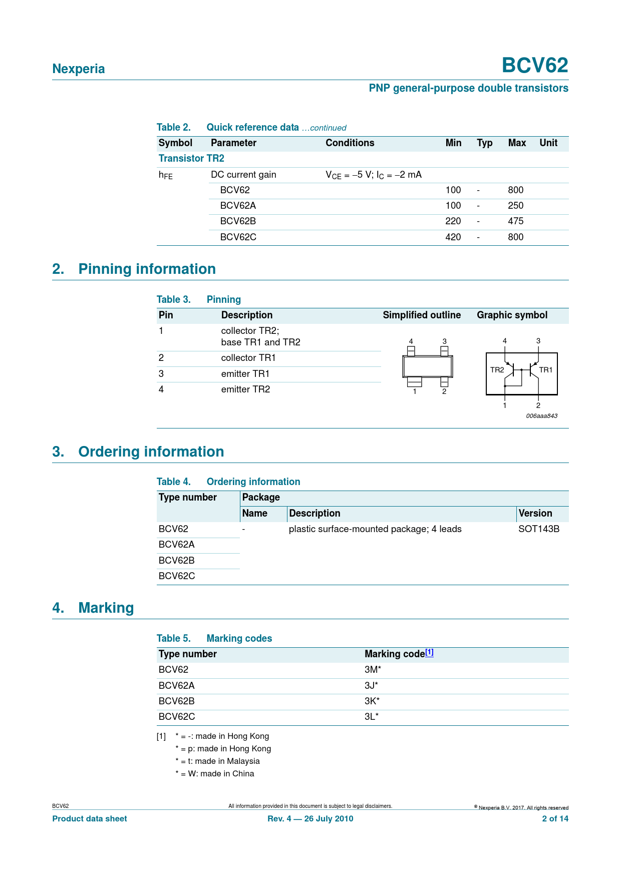 BCV62 3M* BCV62A 3J* BCV62B 3K* BCV62C 3L* [1] * = -: made in Hong Kong * = p: made in Hong Kong * = t: made in Malaysia * = W: made in China BCV62 All information provided in this document is subject to legal disclaimers. © Nexperia B.V. 2017. All rights reserved