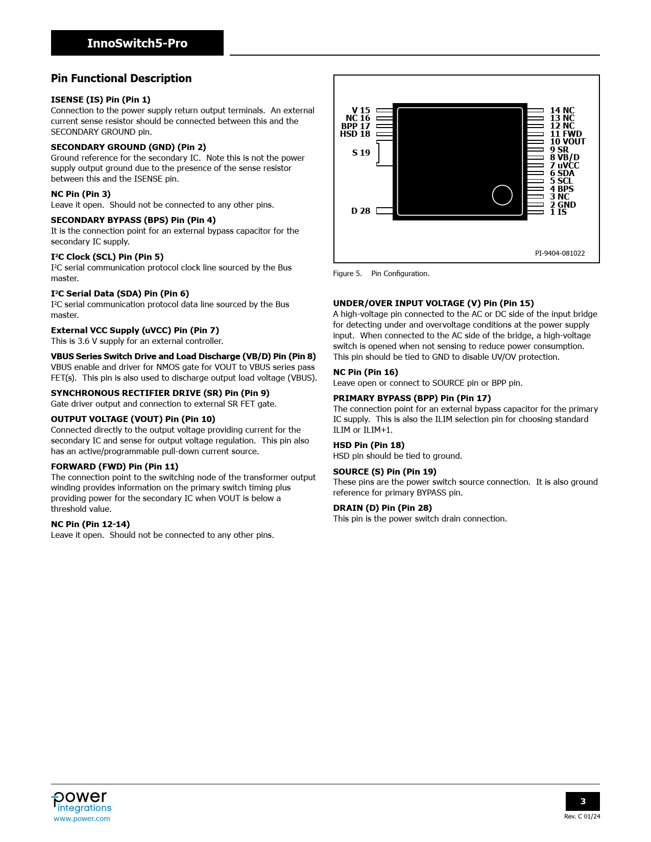InnoSwitch5-Pro. Pin Functional Description ISENSE (IS) Pin (Pin 1). V 15. 14 NC. NC 16. 13 NC. BPP 17. 12 NC. HSD 18. 11 FWD