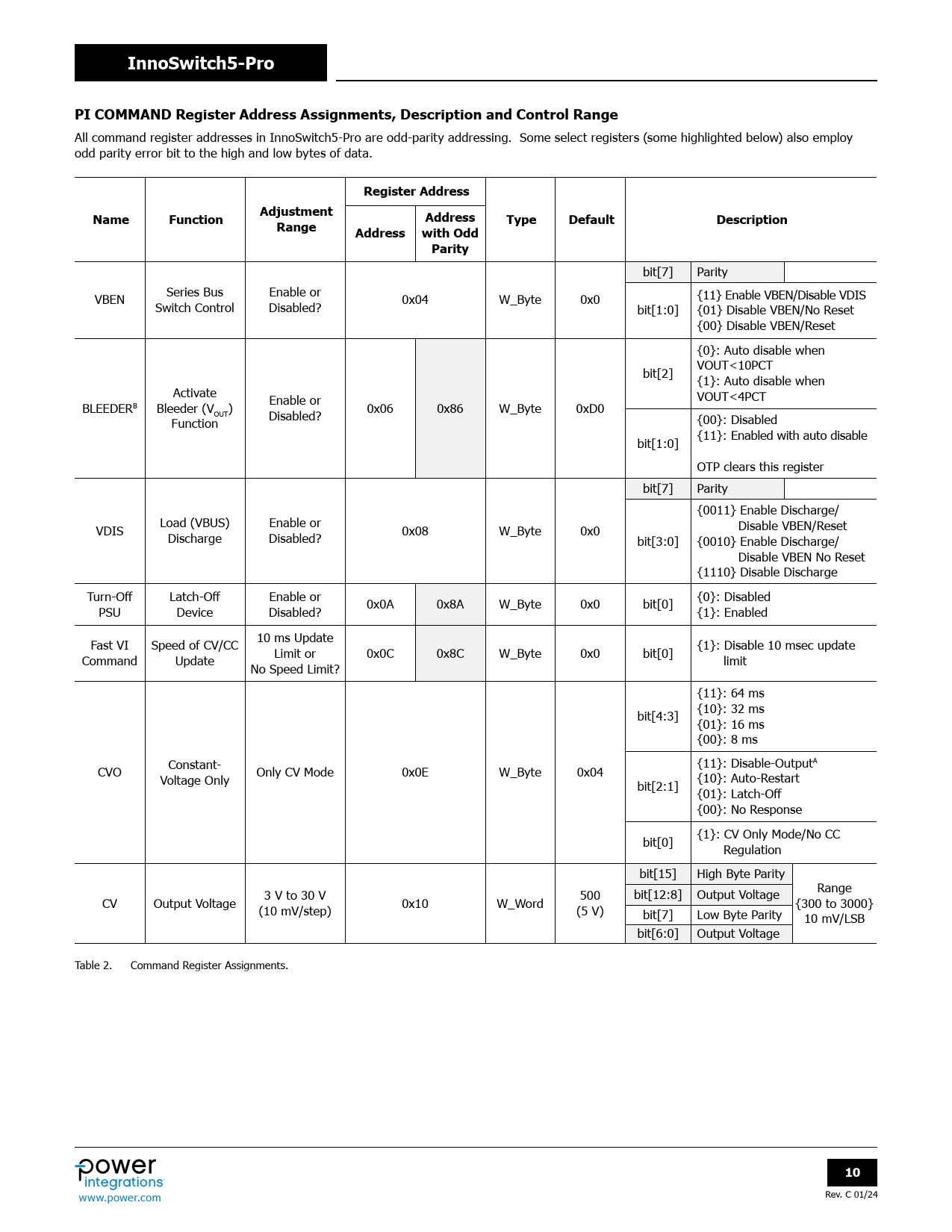 页数 / 页58 / 10 — InnoSwitch5-Pro. PI COMMAND Register Address Assignments, Description and …
