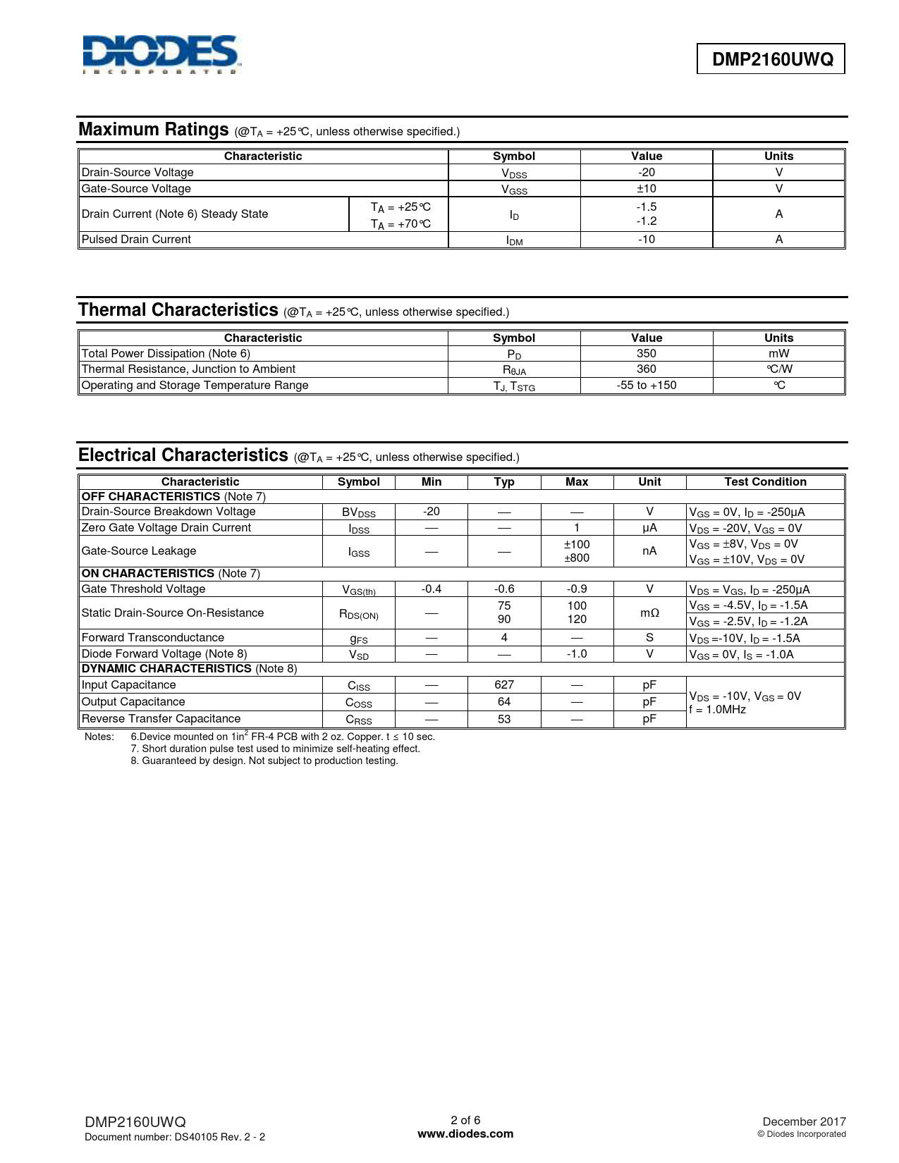 | 页数 / 页 | 6 / 2 — DMP2160UWQ. Maximum Ratings. Characteristic. Symbol. Value. Units. … |