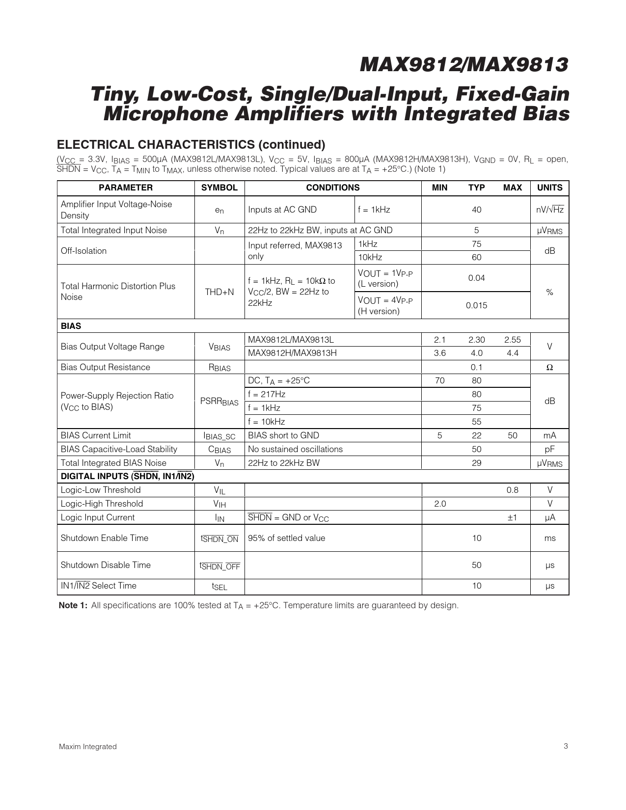 MAX9812/MAX9813Tiny, Low-Cost, Single/Dual-Input, Fixed-GainMicrophone Amplifiers with Integrated BiasELECTRICAL CHARACTERISTICS (continued) (VCC = 3.3V, IBIAS = 500µA (MAX9812L/MAX9813L), VCC = 5V, IBIAS = 800µA (MAX9812H/MAX9813H), VGND = 0V, RL = open, SHDN = VCC, TA = TMIN to TMAX, unless otherwise noted. Typical values are at TA = +25°C.) (Note 1) PARAMETERSYMBOLCONDITIONSMINTYPMAXUNITS Amplifier Input Voltage-Noise en Inputs at AC GND f = 1kHz 40 nV/√Hz Density Total Integrated Input Noise Vn 22Hz to 22kHz BW, inputs at AC GND 5 µVRMS Input referred, MAX9813 1kHz 75 Off-Isolation dB only 10kHz 60 VOUT = 1VP-P 0.04 f = 1kHz, RL = 10kΩ to (L version) Total Harmonic Distortion Plus THD+N VCC/2, BW = 22Hz to % Noise 22kHz VOUT = 4VP-P 0.015 (H version) BIAS MAX9812L/MAX9813L 2.1 2.30 2.55 Bias Output Voltage Range VBIAS V MAX9812H/MAX9813H 3.6 4.0 4.4 Bias Output Resistance RBIAS 0.1 Ω DC, TA = +25°C 70 80 Power-Supply Rejection Ratio f = 217Hz 80 PSRRBIAS dB (VCC to BIAS) f = 1kHz 75 f = 10kHz 55 BIAS Current Limit IBIAS_SC BIAS short to GND 5 22 50 mA BIAS Capacitive-Load Stability CBIAS No sustained oscillations 50 pF Total Integrated BIAS Noise Vn 22Hz to 22kHz BW 29 µVRMS DIGITAL INPUTS ( SHDN , IN1/ IN2 ) Logic-Low Threshold VIL 0.8 V Logic-High Threshold VIH 2.0 V Logic Input Current IIN SHDN = GND or VCC ±1 µA Shutdown Enable Time tSHDN_ON 95% of settled value 10 ms Shutdown Disable Time tSHDN_OFF 50 µs IN1/IN2 Select Time tSEL 10 µs Note 1: All specifications are 100% tested at TA = +25°C. Temperature limits are guaranteed by design. Maxim Integrated 3