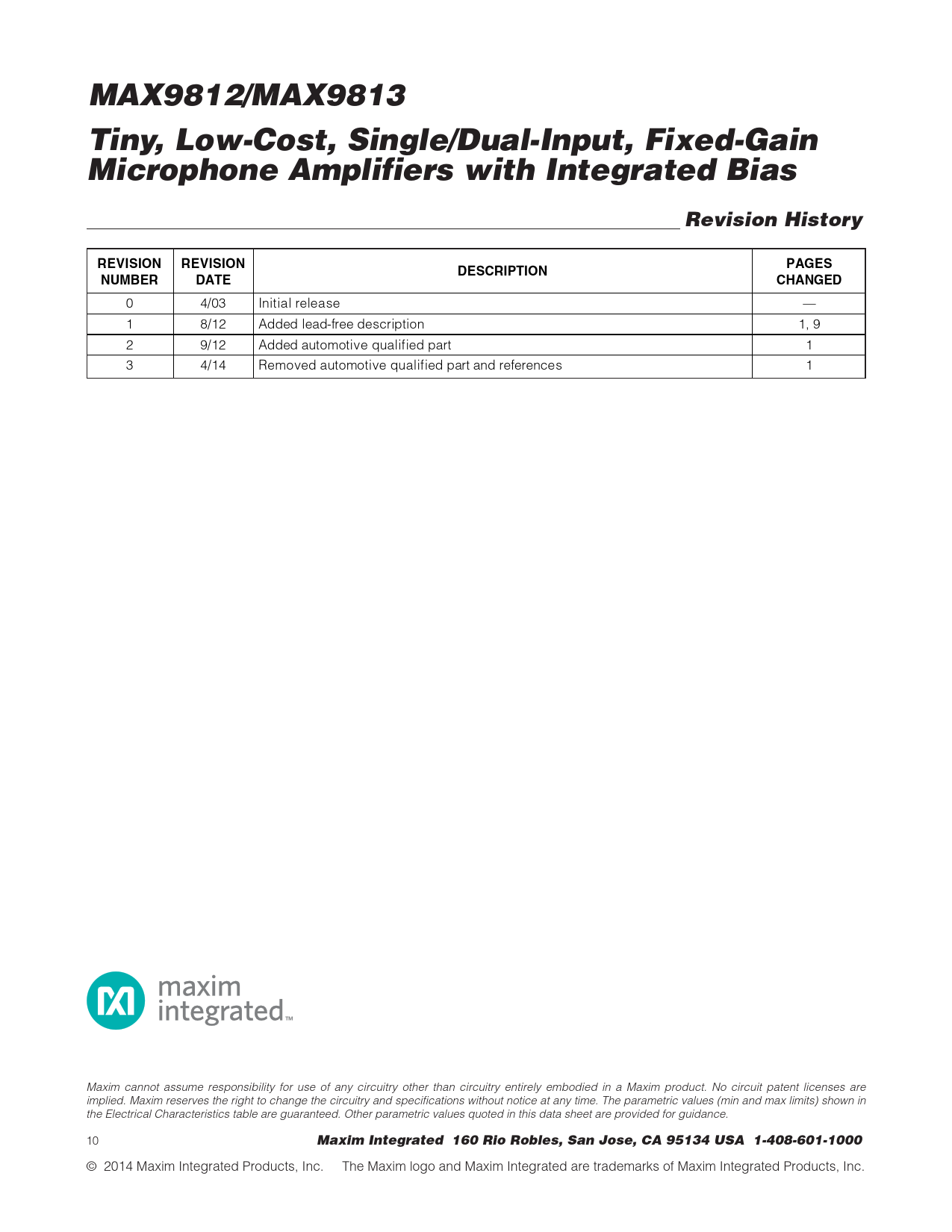 0 4/03 Initial release — 1 8/12 Added lead-free description 1, 9 2 9/12 Added automotive qualified part 1 3 4/14 Removed automotive qualified part and references 1 Maxim cannot assume responsibility for use of any circuitry other than circuitry entirely embodied in a Maxim product. No circuit patent licenses are implied. Maxim reserves the right to change the circuitry and specifications without notice at any time. The parametric values (min and max limits) shown in the Electrical Characteristics table are guaranteed. Other parametric values quoted in this data sheet are provided for guidance. 10
